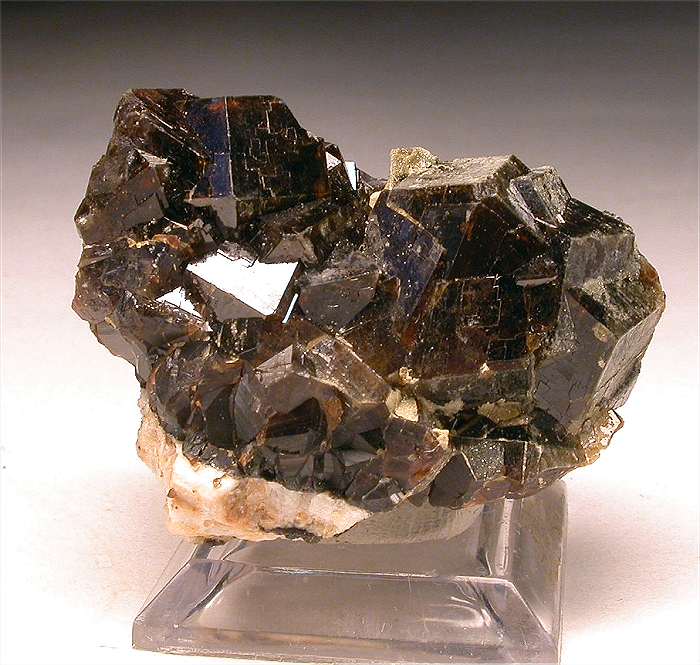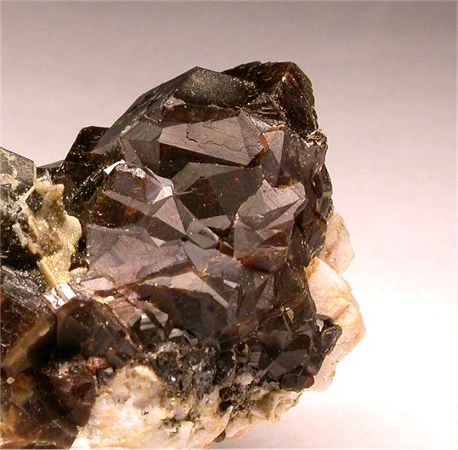Chifeng, Inner Mongolia, China - Bright dark brown andradite crystals nicely grouped forming clusters. The specimen shows a dozen andradites up to 1-1.5 cm in diameter ! Nice rock of 4x3x3 cm