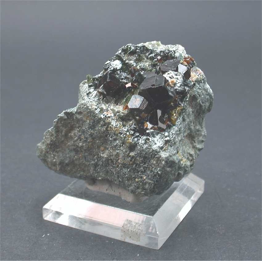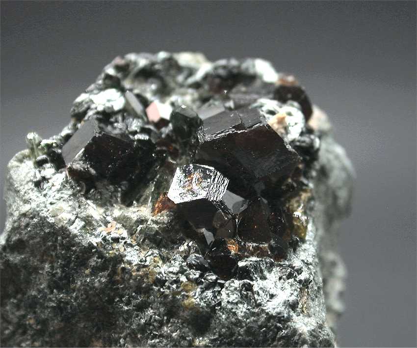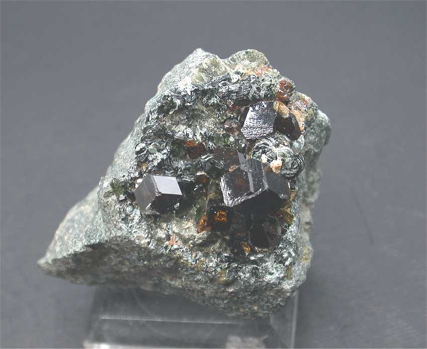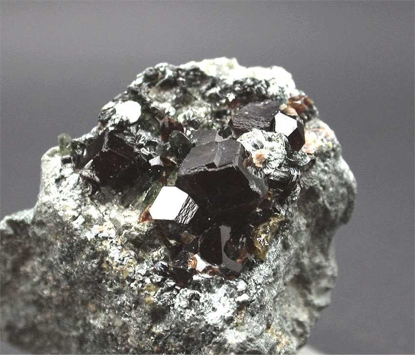 Khogyani, Nangarhar Province, Afghanistan - A nice specimen with several large andradite crystals up to 1 cm wide with diopside and chlinochlore. Overall size is 4.5x4x4 cm. Weight is 102 gr.