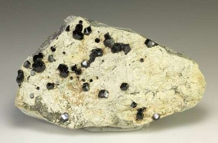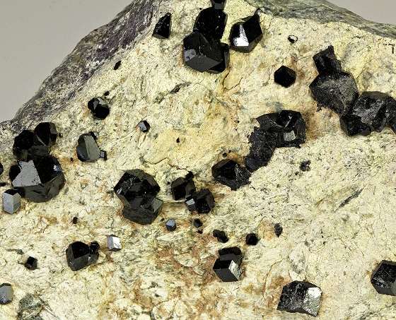 San Benito Co., California, USA - Lustrous black crystals of andradite var melanite measuring to 0.5 cm in size over the front of a 4.5 x 3.5 x 1.0 cm matrix. In very good condition as seen with only minimal contacting typical of these. The back of the matrix has been sawn. Ex Chris & Agatha Galas collection.