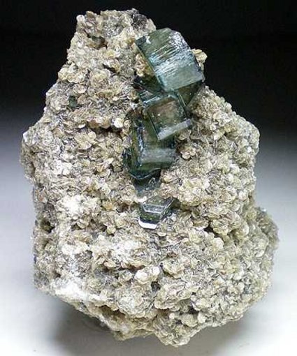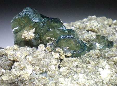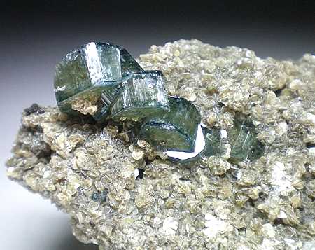 Panasqueria Mine, Beira Baixa, Portugal - This specimen of muscovite is host to a group of color zoned crystals of apatite. This inky blue color is rare from Panasqueira. All but one of the crystals are complete. The back crystal is on the edge of the specimen and is about 80% complete. Overall size is 6.5x5.0x4.6 cm. Ex Luis Miguel Fernandez Burillo collection