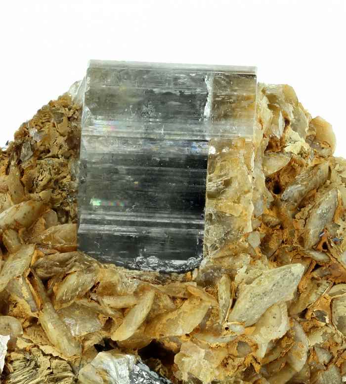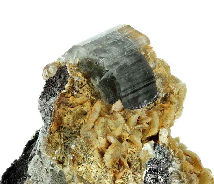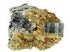 Panasqueira Mine, Beira Baixa, Portugal - A large single glassy two colour green apatite crystals with discs of siderite formed over an arsenopyrite/wolframite/cassiterite matrix. The apatite is 1.5x1 cm in size ! Veri nice and bright ! Overall size is 3.7 × 3.4 × 2.8 cm.