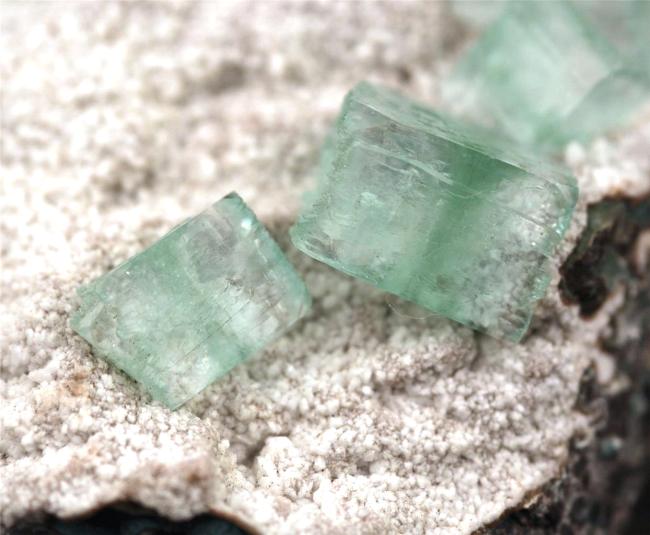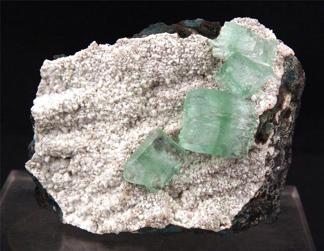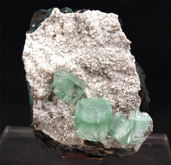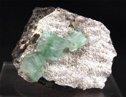 Pune, Maharashtra, India - Nice and peculiar apophyllites crystals show up on this rock. The crystals have a very nice luster and brightness and show a peculiar green zoning inside. Very nice ! The crystals are up to 1.5x1 cm in size. Overall size is 6x5x3 cm