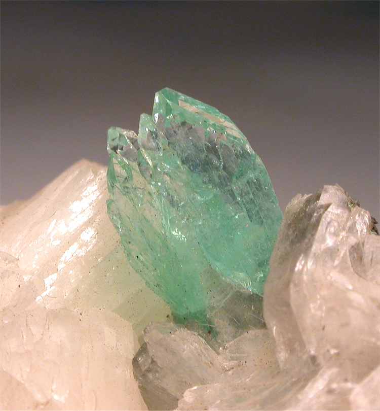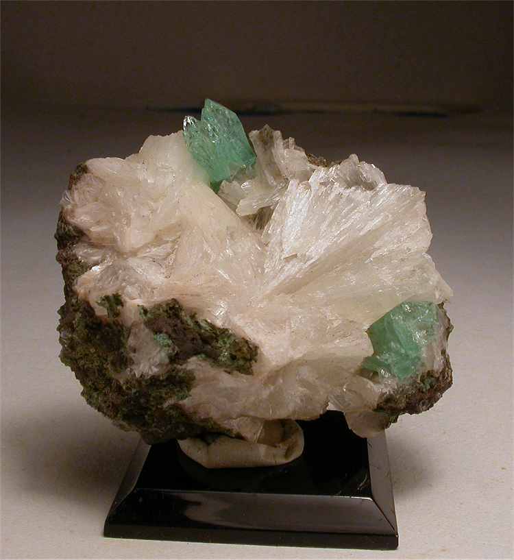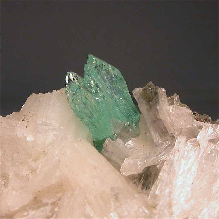 Pune, Maharashtra, India - Bright green apophyllite crystals show among heulandite crystals. The apophyllites have a sperkling green color and are terminated. Their size is 1.3 cm and are well visible among the white centimetric heulandites ! Nice specimen of 5.5x4.5x3 cm.