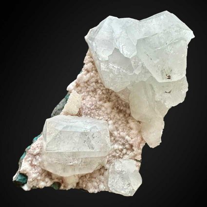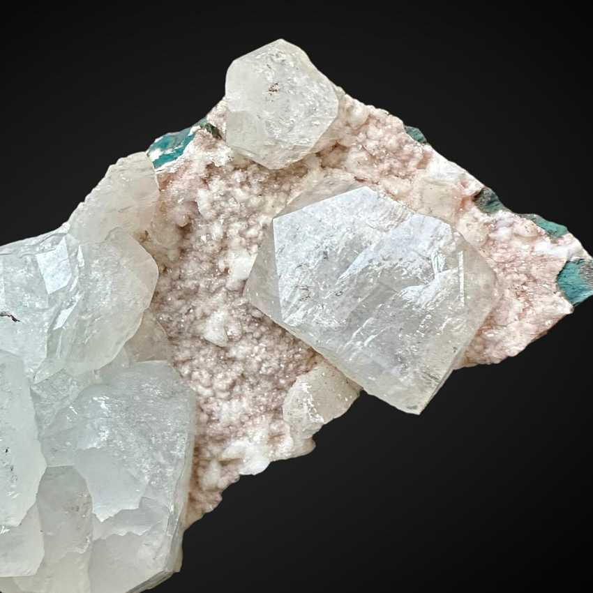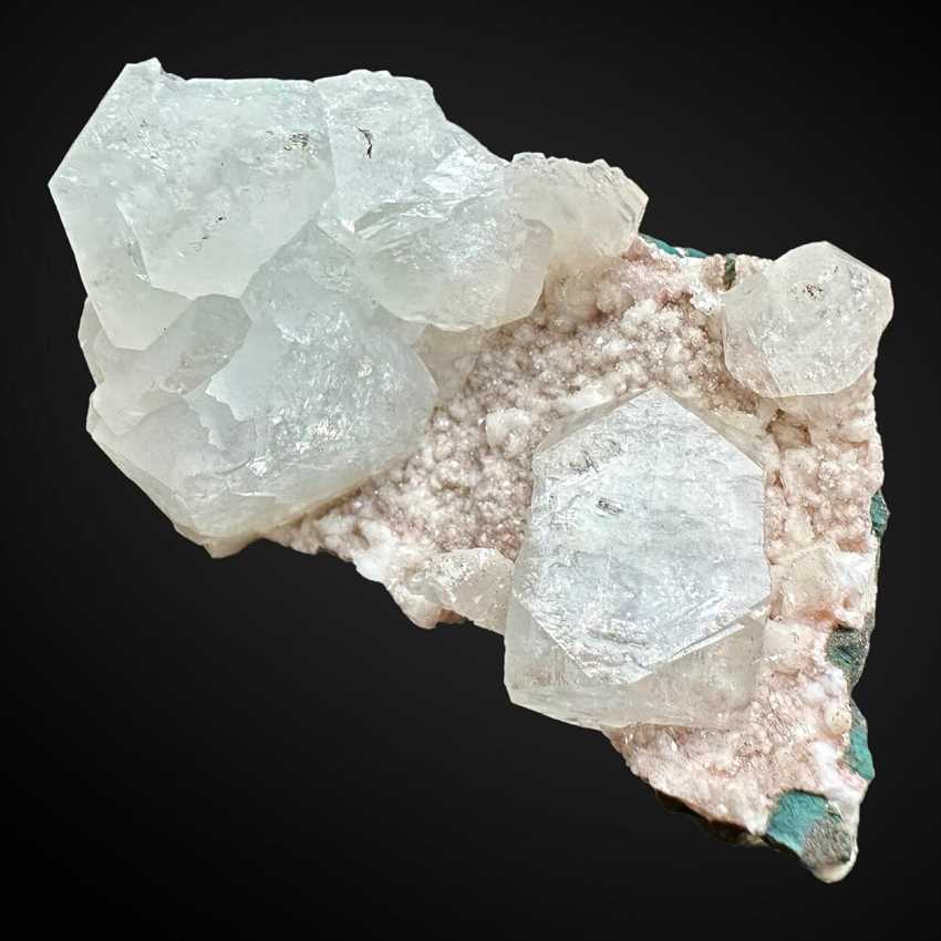 Jalgoan Quarries, Maharashtra, India - Large fairly well-isolated crystals of blue-grey apophyllite are stacked up on a matrix of basalt amygdale covered with smaller crystals of apophyllite with a ligth pinkish color. Apophyllites are up to 2.3 cm in size.Overall size is 7 × 4 × 5 cm. Weight is 140 gr