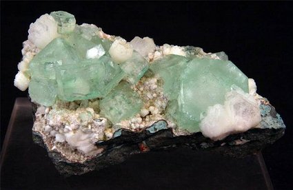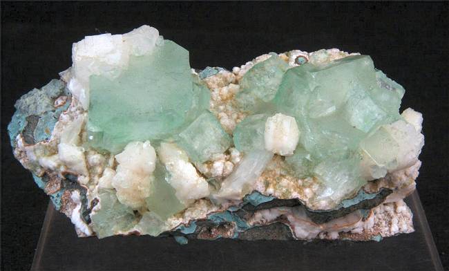 Pune, Maharashtra, India - There are a dozen cubic apophylite crystals green in color with several books of heulandite crystals all around and on the apophyllites. Nice specimen of 7.5x4x3.5 cm