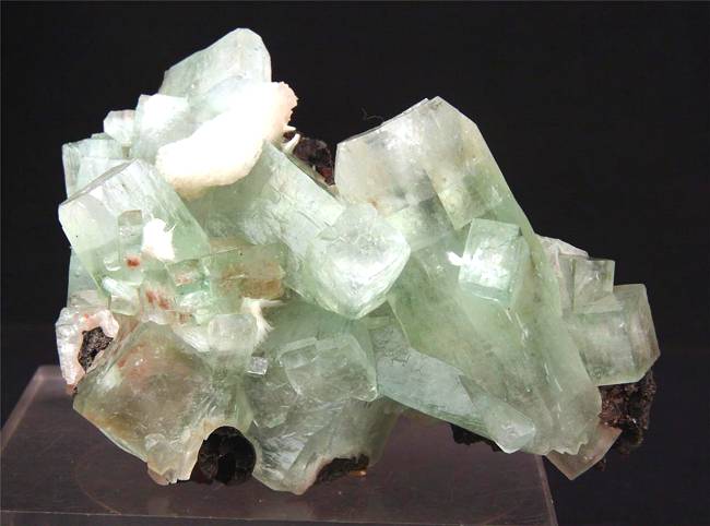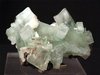 Pune, Maharashtra, India - Cluster with a dozen green apophyllite. There are also a stilbite and some sprays of mordenite ! The apophyllites are up to 4.7 cm long and on some of them there some spray of acicular mordenite. A 2.3 cm terminated stilbite sits among some apophyllites ! overall size is 8.5x5x5 cm