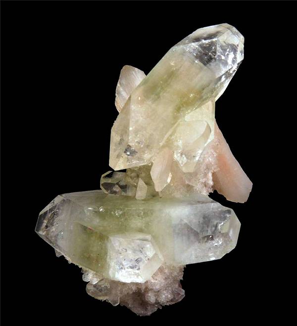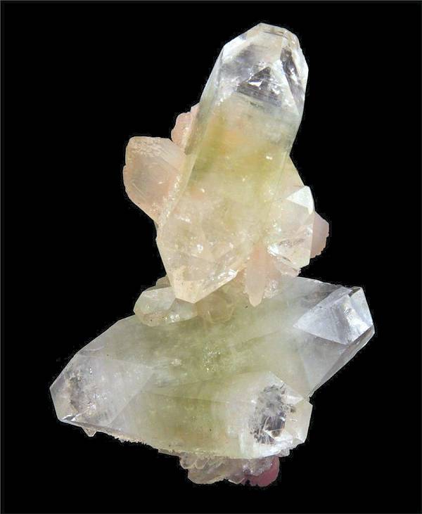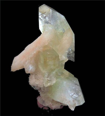 Pune, Maharashtra, India - Very nice specimen with no contacts: a floater. There are half a dozen bicolored apophyllite crystal, most of them are biterminated ! A couple of light pink stilbites up to 3 cm are intergrown with the apophyllites that are up 4.5 cm ! overall size is 6.2x4x4 cm