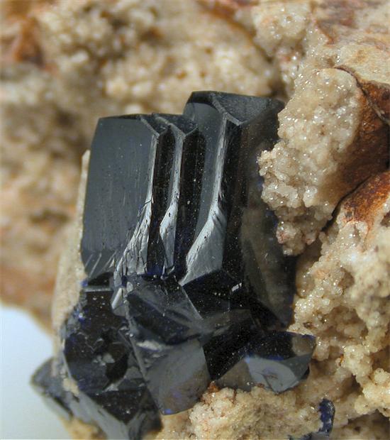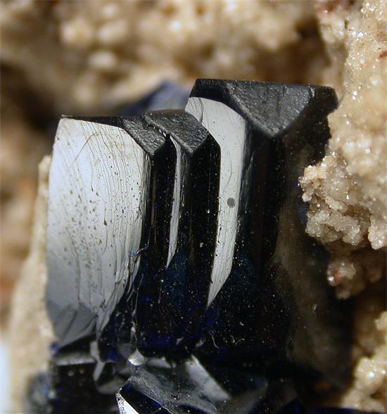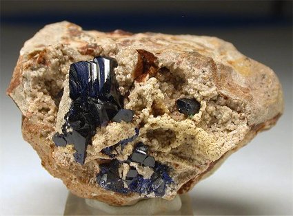 Touissit Mine, Oujda, Meknès-Tafilalet Region, Morocco - Very nice azurite specimen. This rock hosts several deep blue bright azurite crystals up to the size of 1 cm. Great luster and brighthness ! Showy rock of 5.5x4x3.5 cm