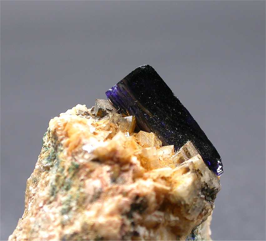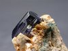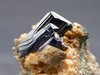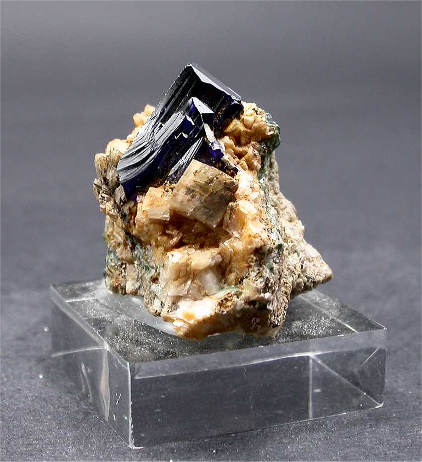 Kerrouchene, Khénifra Province, Meknès-Tafilalet Region, Morocco - Very nice deep blue cluster of terminated azurites ! There are 2 parallel twinned crystals and the main one is biterminated and 1.5 cm in size ! Minor siderite at the base of the crystals. Very nice classic from Morocco. Overall size is 3.5x2.8x2.5 cm. Weight is 35 gr. Mounted on plexy base.