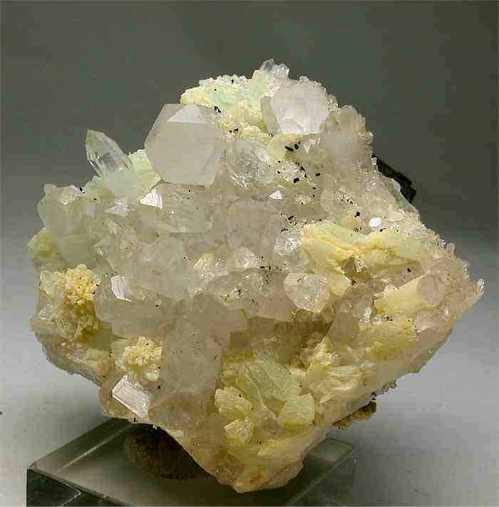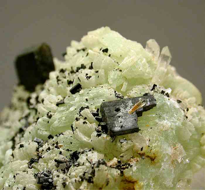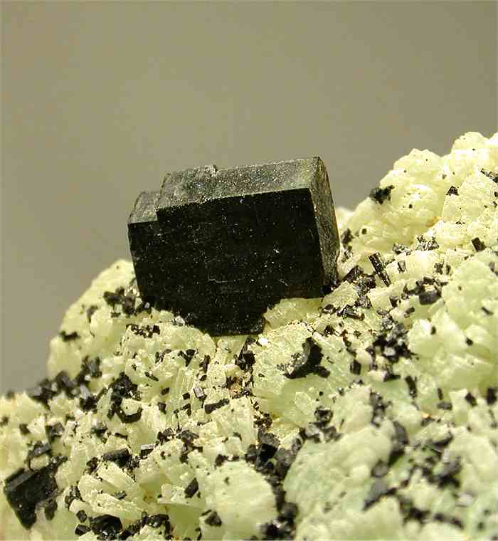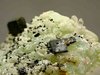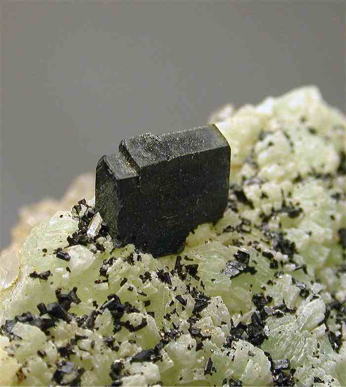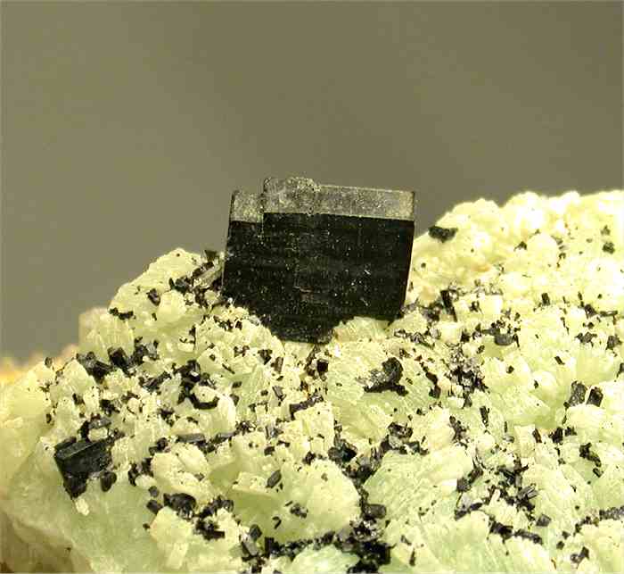 Qiaojia, Zhaotong Prefecture,Yunnan Province, China - Very nice well shape undamaged babingtonite crystal of 0.9 cm on the edge ! The crystal is nicely located on a coating of prhenite, light green in color. There is an othe 0.5 cm crystal on the right of the rock and many tiny black ones dispersed on the prhenite. On the other side the rock has a a nice amount of quartz crystals with prhenite . Overall size is 5x4.8x3 cm. Weight is 110 gr.
