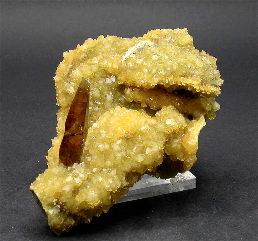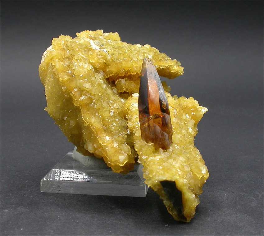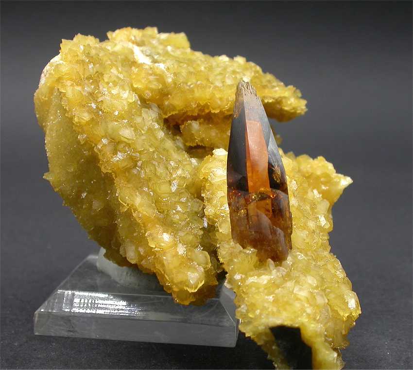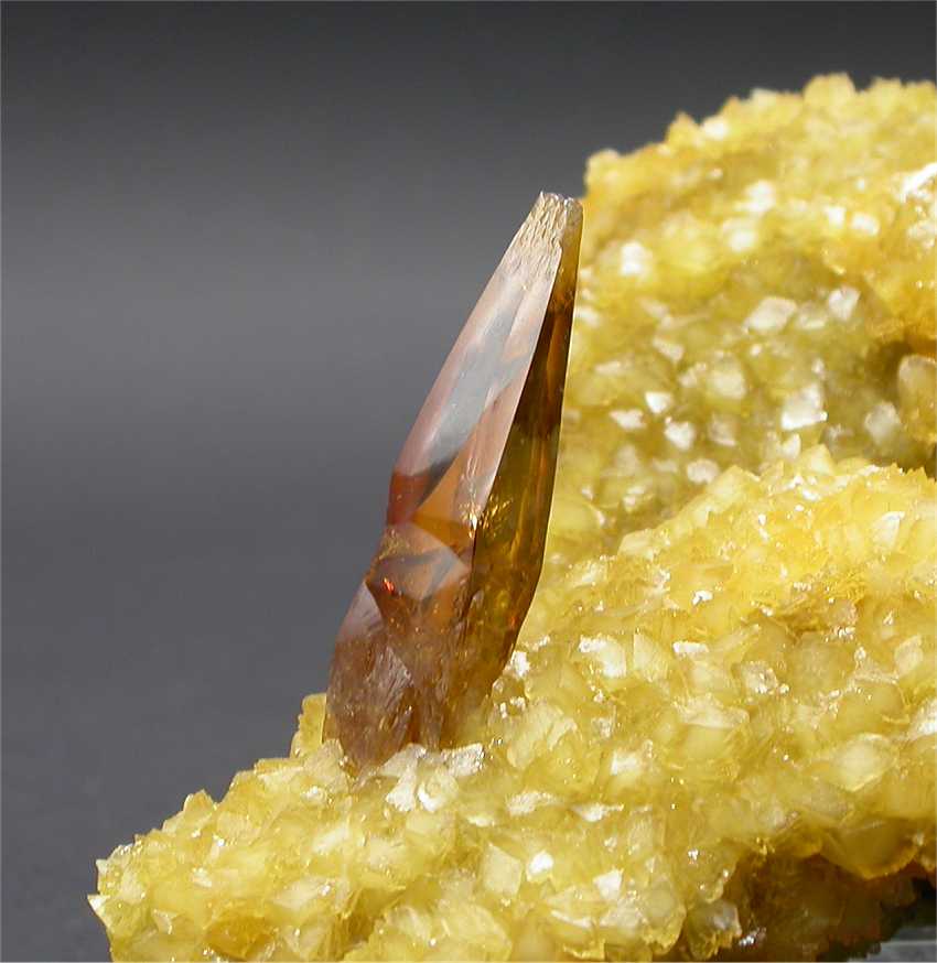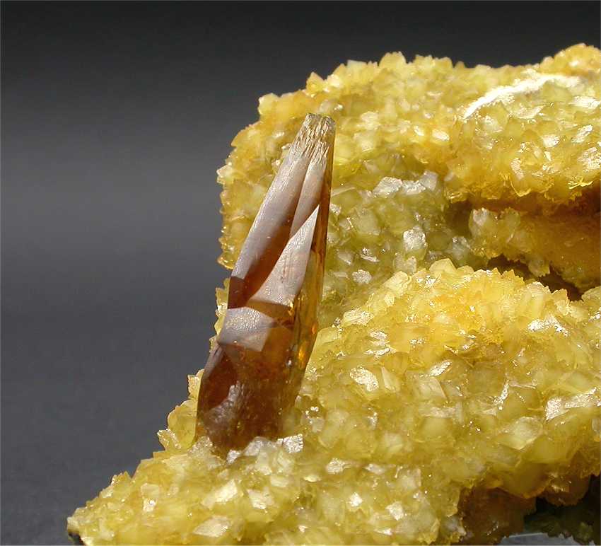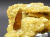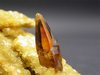 Elk Creek, Meade Co., South Dakota, USA - A very nice and superb barite specimen. The rock host 3 fully terminated barite crystals to the size of 2.5 cm with a wonderful color and transparency ! The crystals show a great honey color and are almost gemmy ! on the left, the specimen shows a coating of bright yello calcite crystals. Overall size is 5.5x5.5x5.5 cm. Weight is 140 gr.