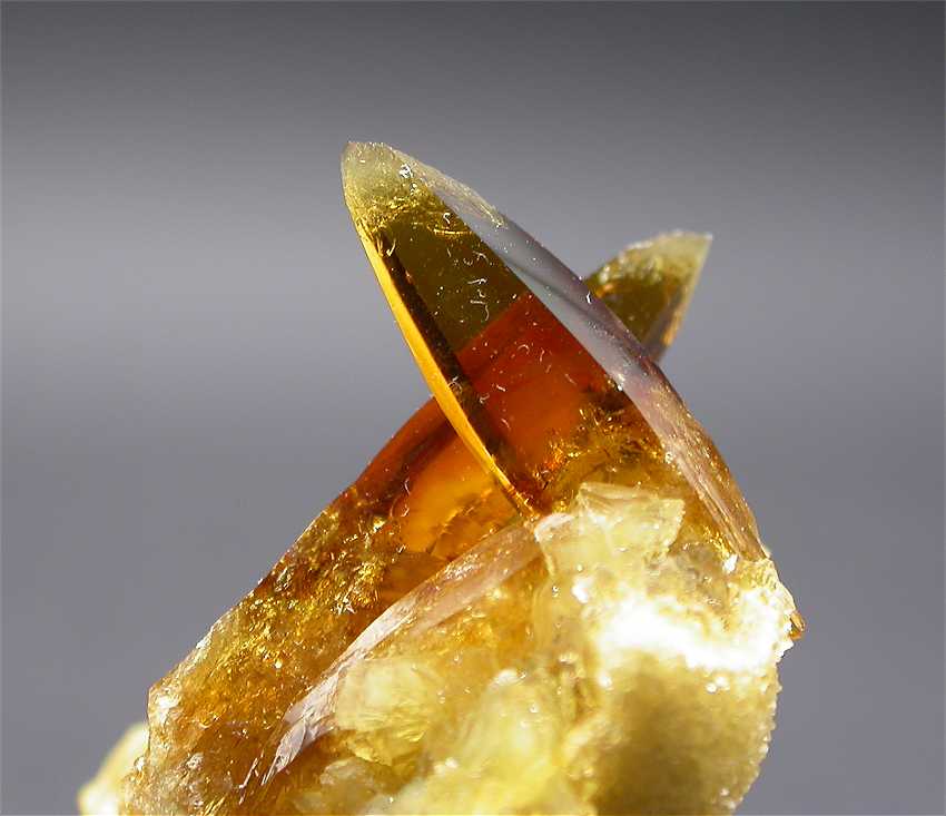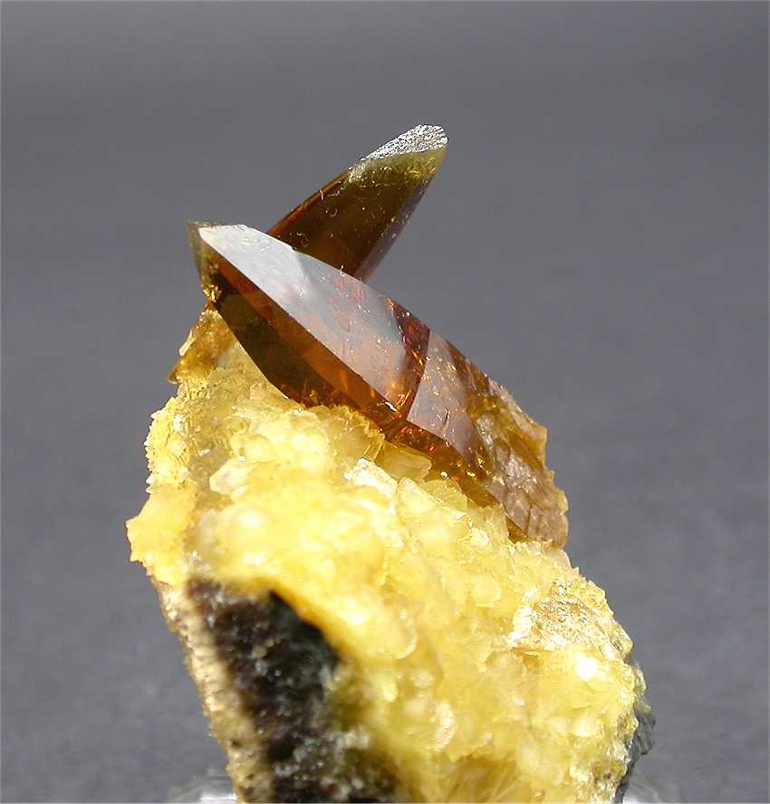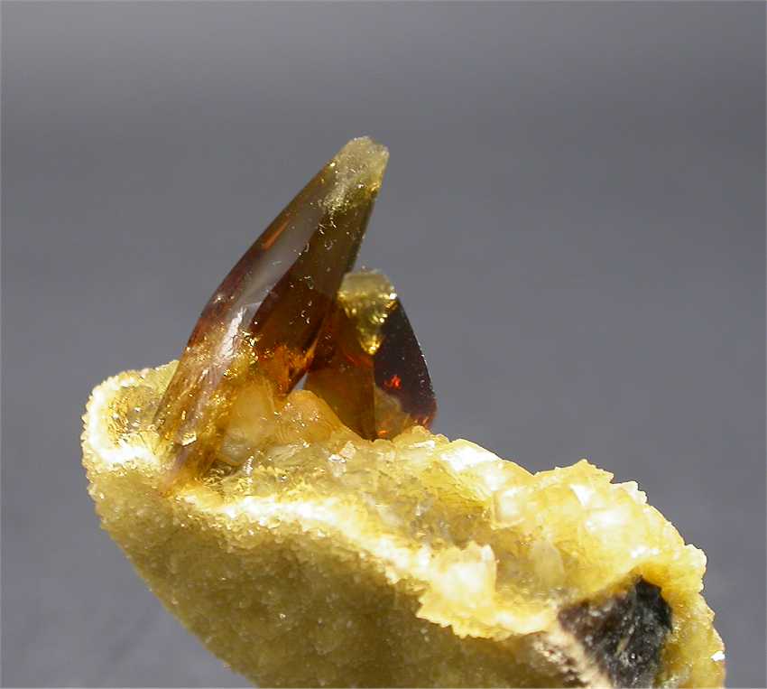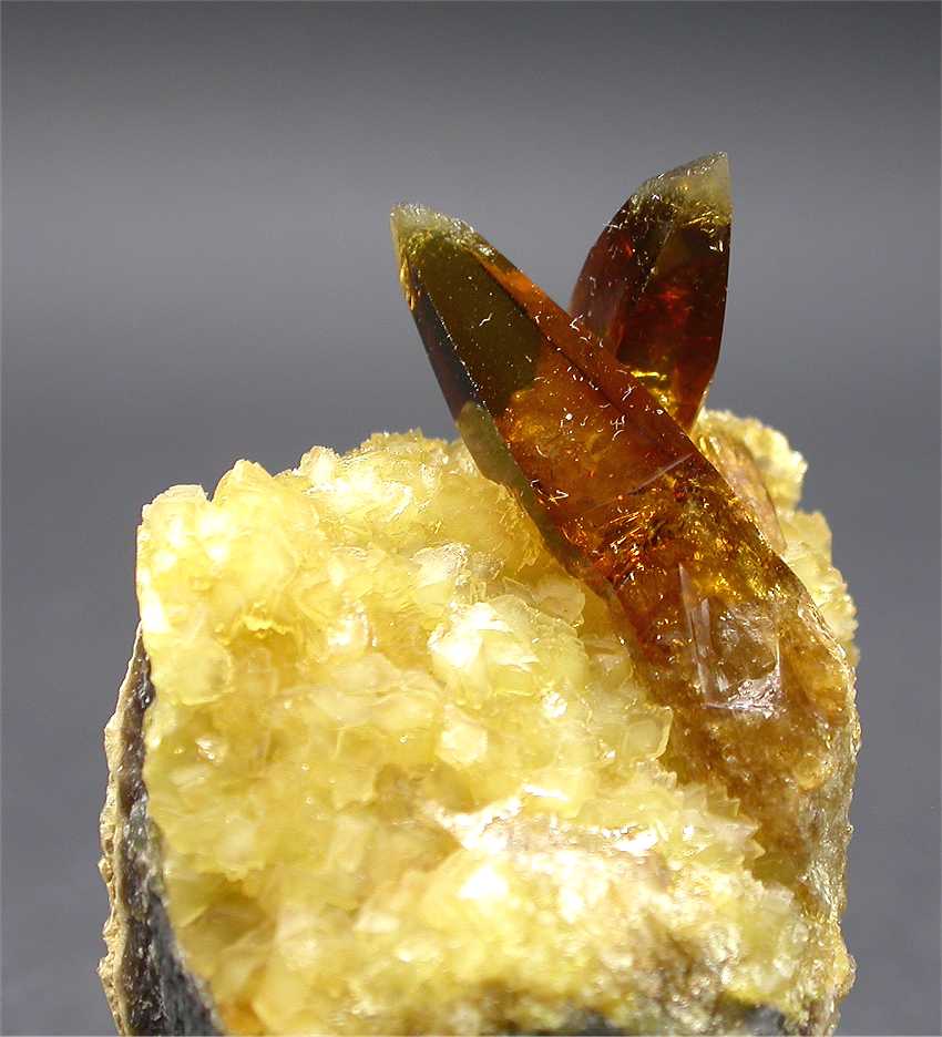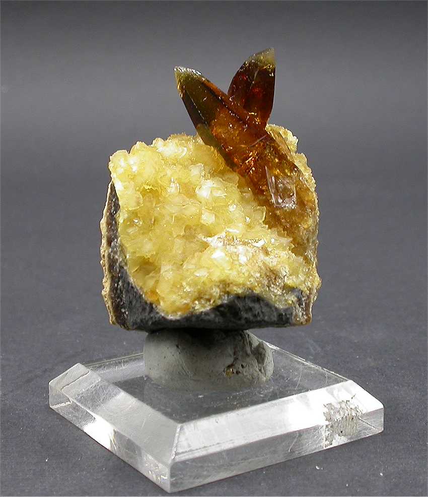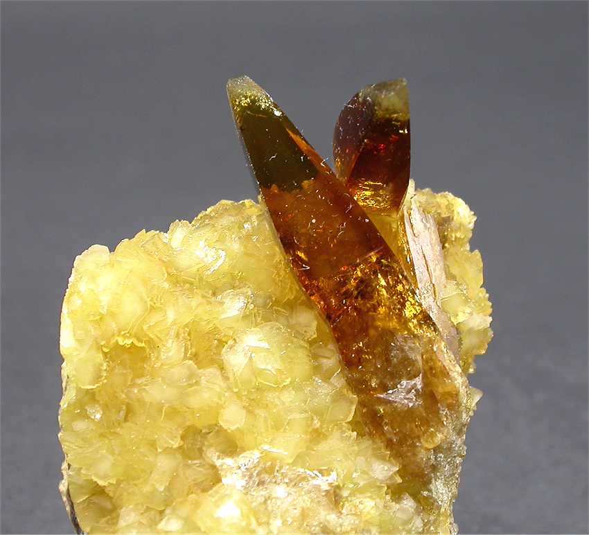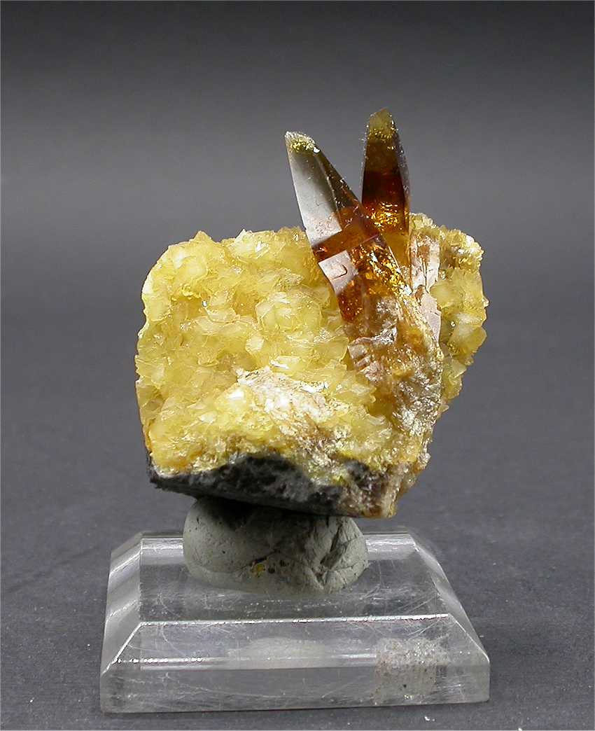 Elk Creek, Meade Co., South Dakota, USA - A superb baryte crystal cluster of baryte ! There are a couple of fully and perfectly terminated barytes ! The crystals are 3.5 and 2.5 cm in size . Great honey color ! The crystals are gemmy ! Superb specimen. The calcite is fluorescent under UV. Overall size is 4.5x4x2.5 cm. Weight is 48 gr.