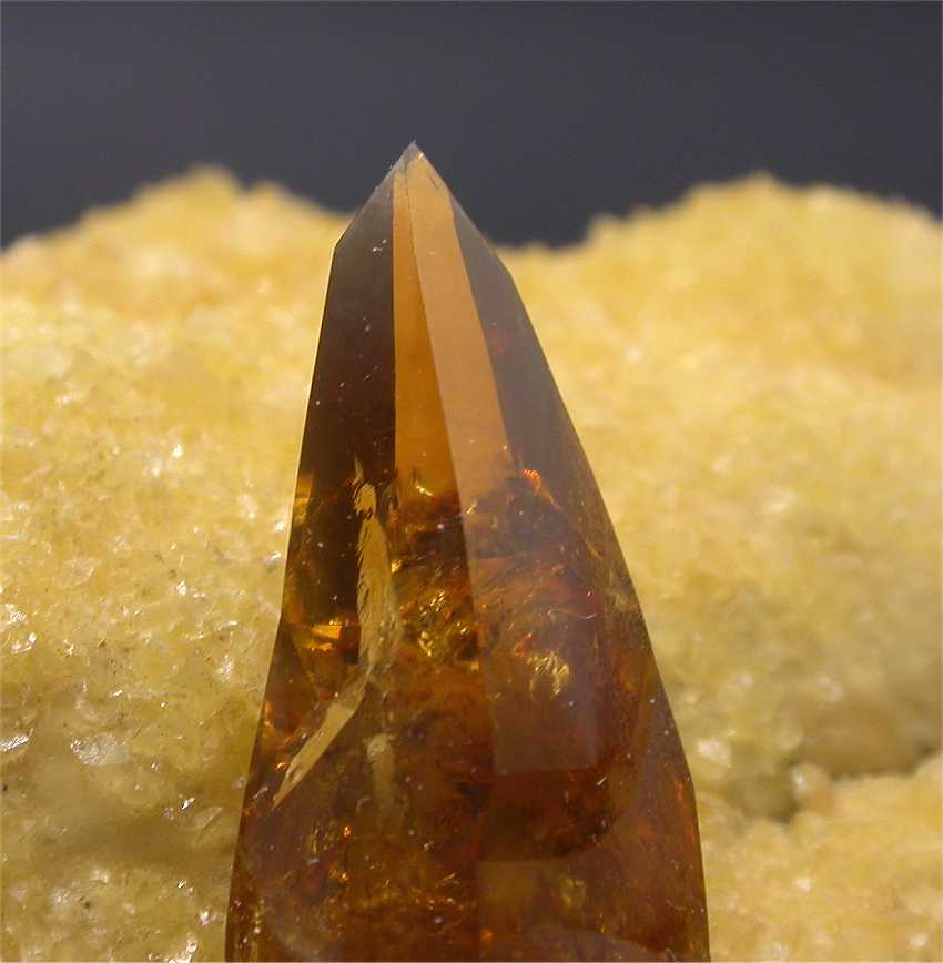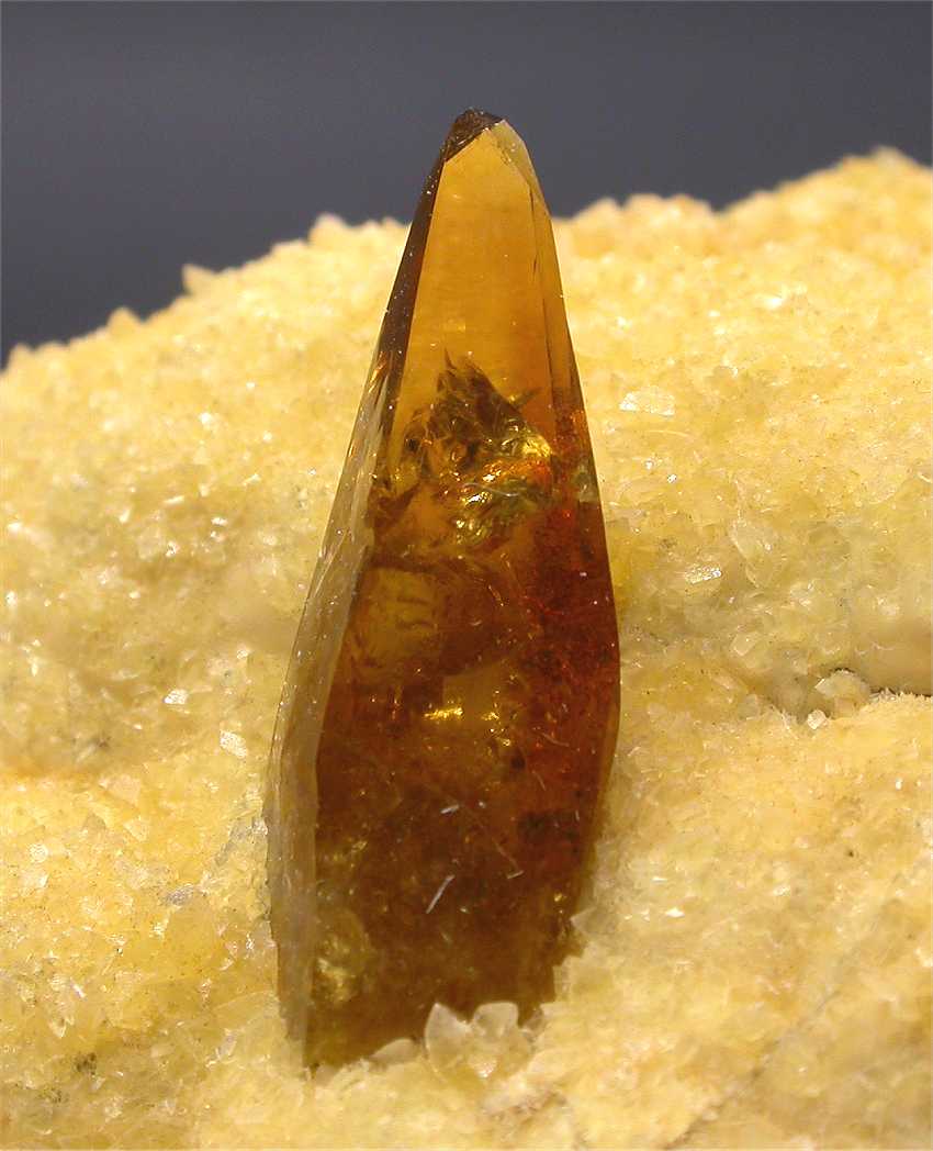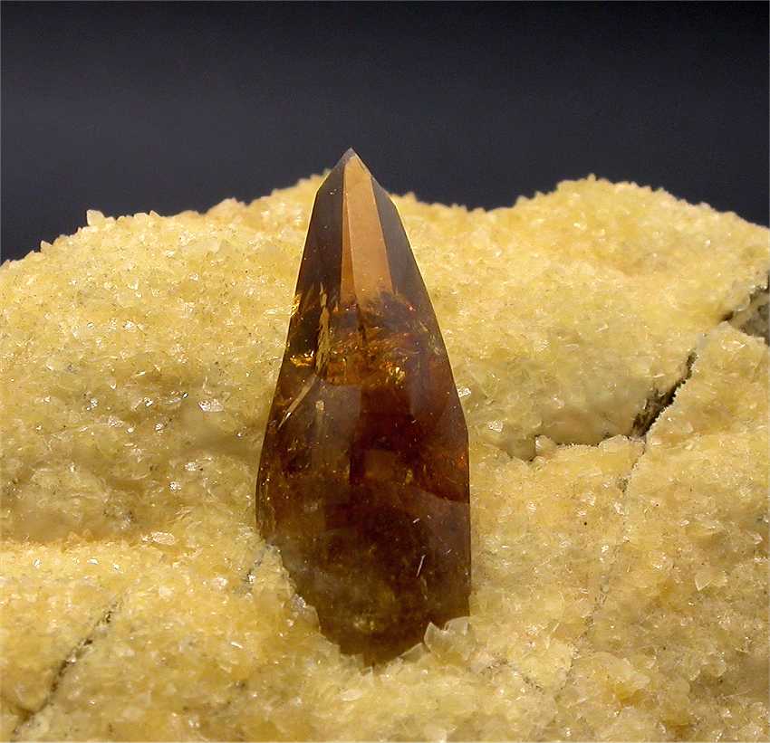 Elk Creek, Meade Co., South Dakota, USA - A superb baryte crystal shows on the yellow crystalline calcite coating of this specimen. The baryte is fully terminated and 2.5 cm in size. No damage ! Great esthetic ! Overall size is 5x4x4 cm. Weight is 115 gr.