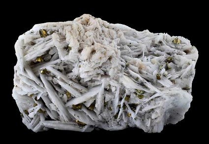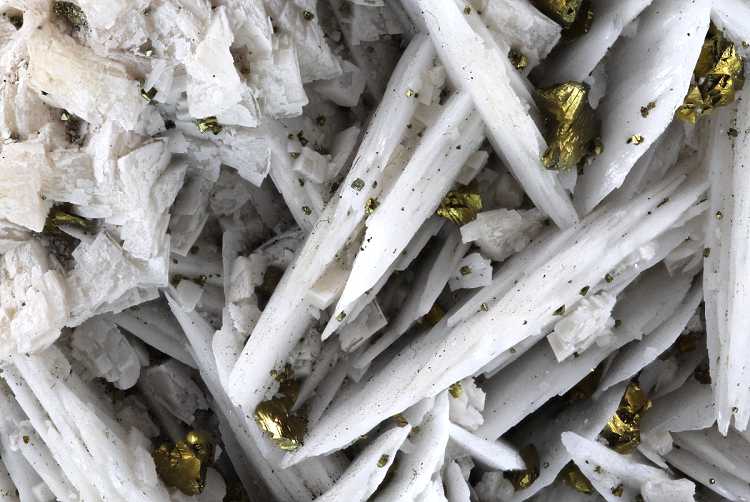 Dreislar, North Rhine - Westphalia, Germany - A good Dreislar example with tightly packed ivory white blades of barite with a pink baryte backing, dotted over by isolated dark golden iridescent chalcopyrite and some off white dolomite rhombs. Size: 4.3 × 7.1 × 4.8 cm