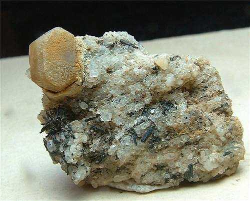 Zagi Mountain, Federally Administered Tribal Areas, Pakistan - This rock hosts a 0.6 cm wide bastnasite crystal, with a nice light brown color. The crystal is undamaged ! Overall size is 2.9x1.9x1 cm. Ex Ikram Mineralogy collection.