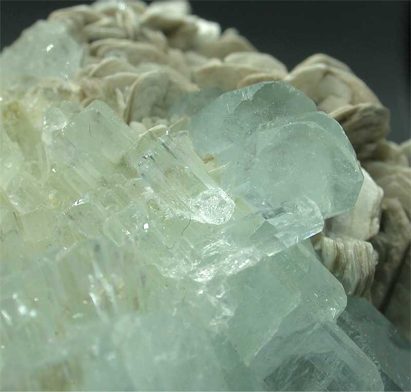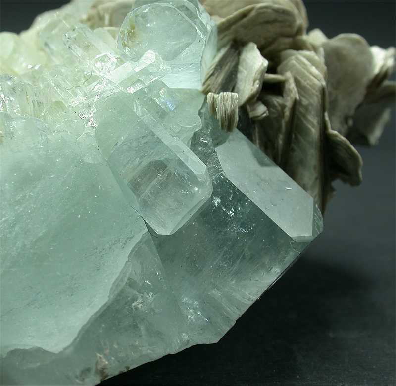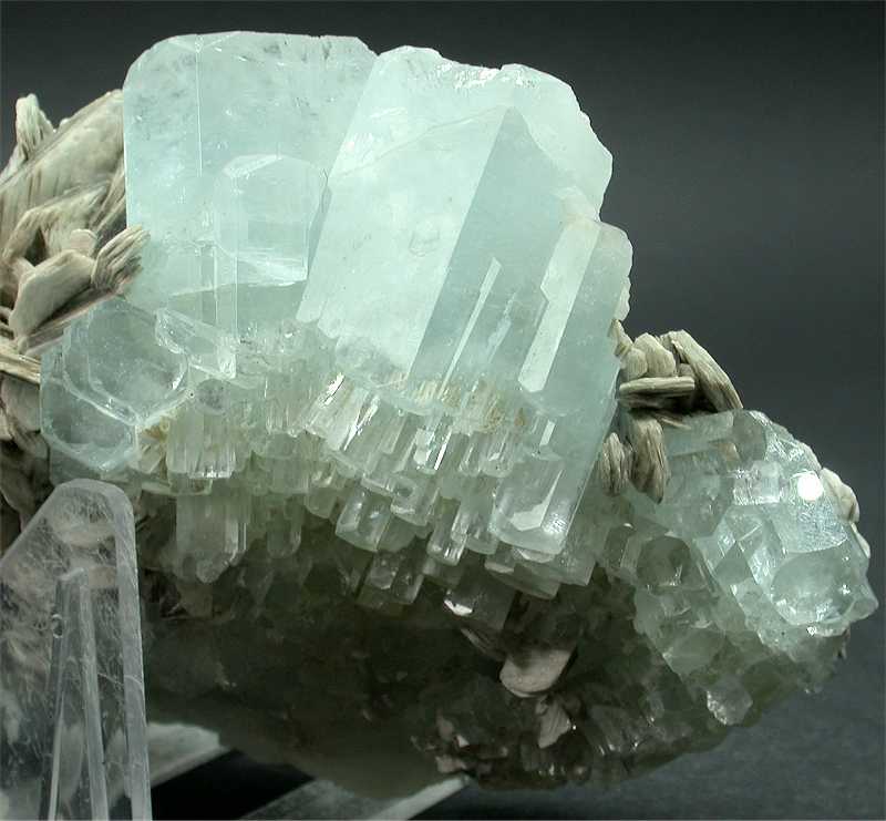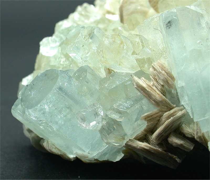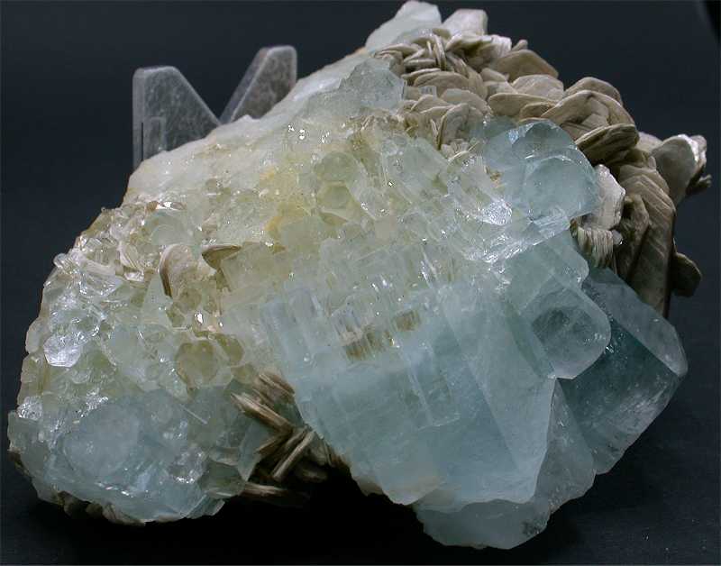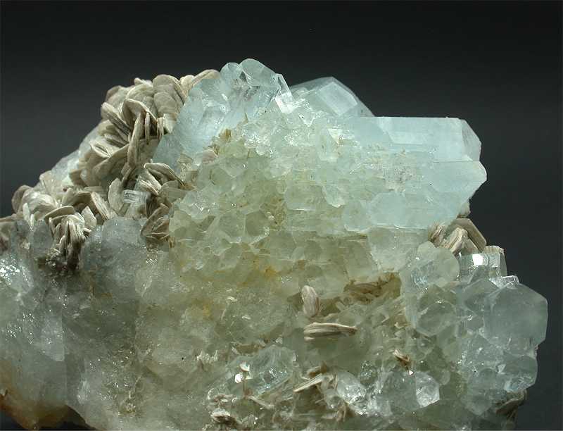 Shigar Valley, Northern Areas, Pakistan - An incredible rich specimen !! There are miriad of terminated beryl var aquamarine crystals here ! The main crystals are in the fronT of the specimen and are up to 3.3 cm in size ! I count more than two dozens of berylS ALL terminated when looking at the specimen from above !! a very nice esthetic specimen. Overall size is 12.5x9x4.5 cm. Weight is 570 gr.