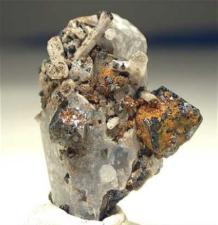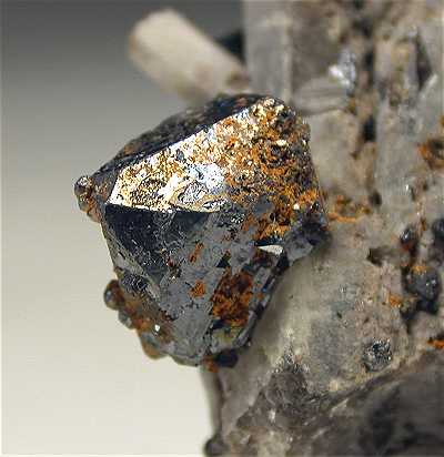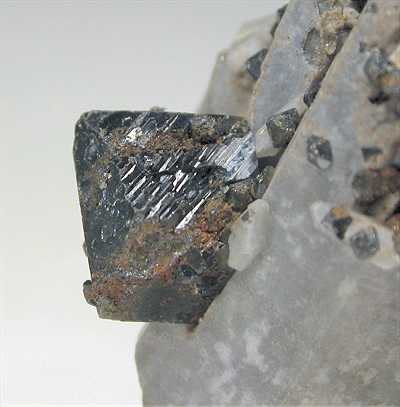Magnet Cove, Hot Spring Co., Arkansas, USA - Bright brookite crystals show up on this specimen. The quartz crystal hosts a lot of bright metallic millimetric brookite crystals and the two main crystals are 0.8 cm on the edge ! Real showy specimen of 3.2x3x2 cm in size