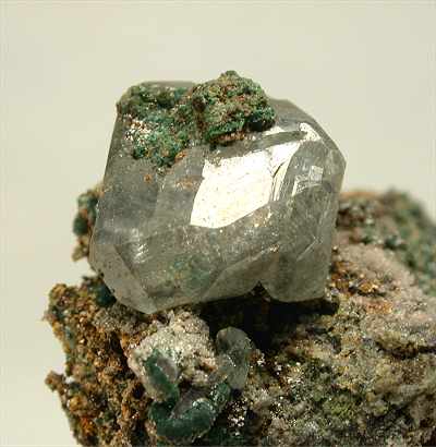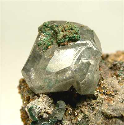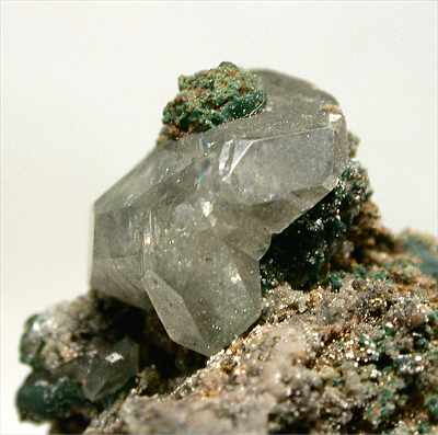 TSUMEB MINE, TSUMEB, NAMIBIA - A classic from this defunct locality. A perfectly terminated cerussite crystal seats on this malachite covered specimen. The cerussite is 1 cm in size and damage free. Overall size is 3x2x2 cm.