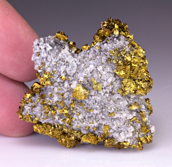 Sweetwater Mine, Reynolds Co., Missouri, USA - Beautiful iridescent brassy to purplish large crystals of chalcopyrite to 1.0 cm in size scattered over the top of a 4.5 x 4.5 x 2.0 cm dolomite crystal coated matrix. Shows nicely all around and in excellent condition. Very good large crystals for the species from this locality.