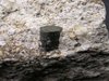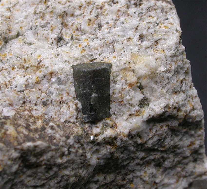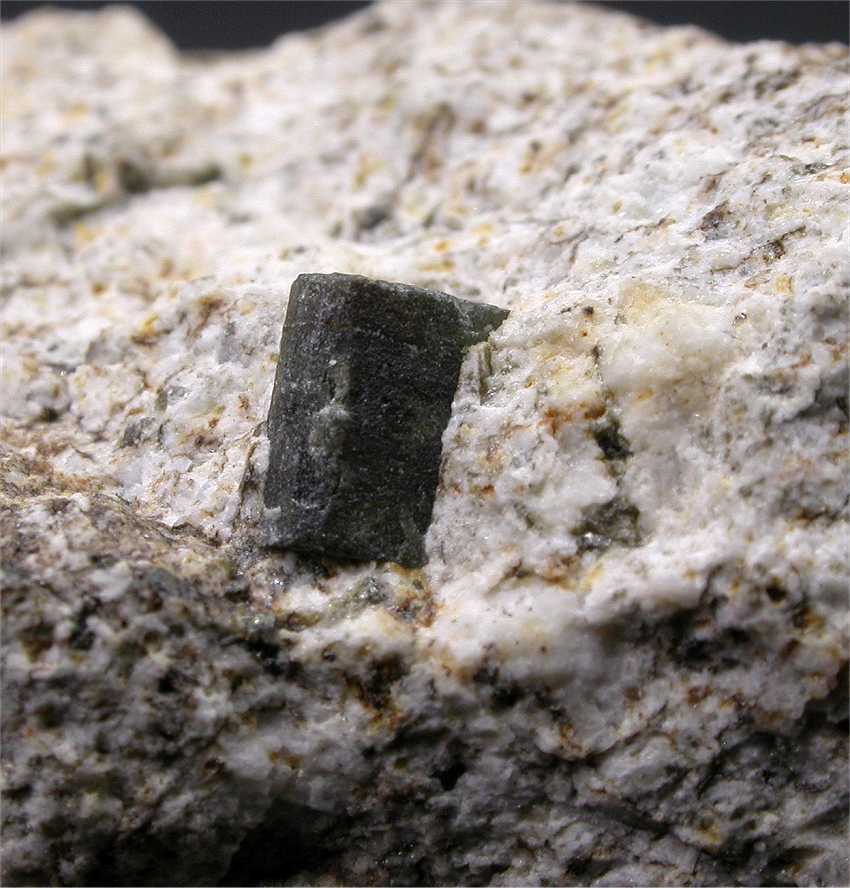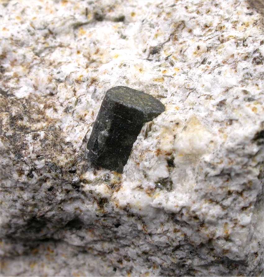 Cava di Melis, Longobucco, Cosenza, Calabria, Italy - The recent new find of cordierite from Italy ! Probably the best and better defined crystals of cordierite vere found in Italy. This specimen hosts a perfectly terminated prismatic cordierite of 0.9 cm in size. The color is green/brown for a coating of pinite. Very nice ! overall size is 3x2.5x2 cm. Weight is 30 gr.