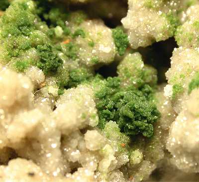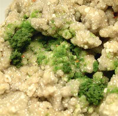 Tsumeb Mine, Otavi Highlands, Namibia - On a dolomite micro crystalline coatine there is a large amount of micro crystals of green duftite ! Nice specimen from the Tsumeb area ! Overall size is 7x6x4.5 cm. Ex Trinity minerals (J. Veevaert) specimen