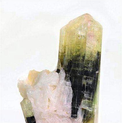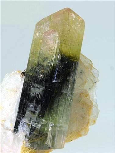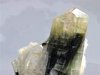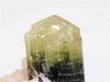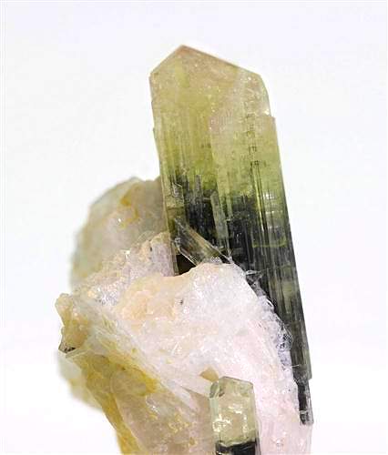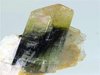 Stak Nala, Skardu District, Pakistan - Double terminated elbaite attached to a book of cleavelandite. The crystal is undamaged and 3.2 cm long ! it shows a light yellow on one end and green on the other. There is a smaller 1.3 cm terminated elbaite on a side. Overall size is 4.7x2.5x2 cm
