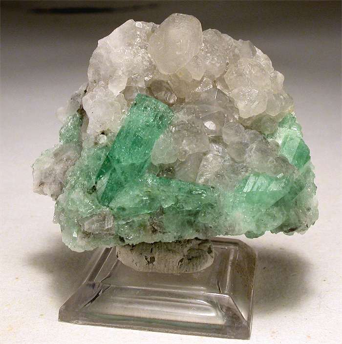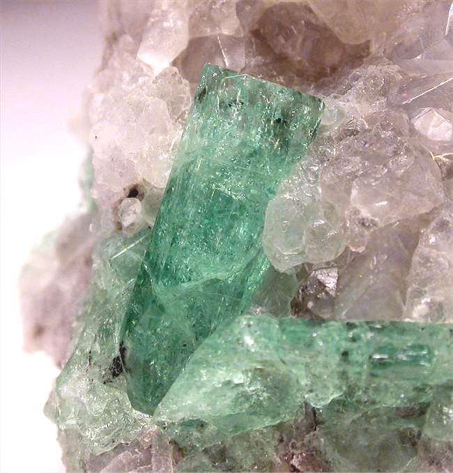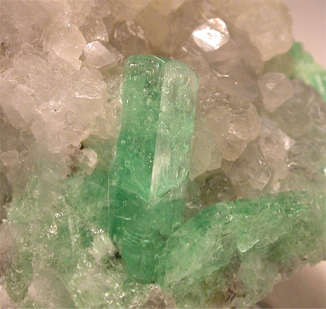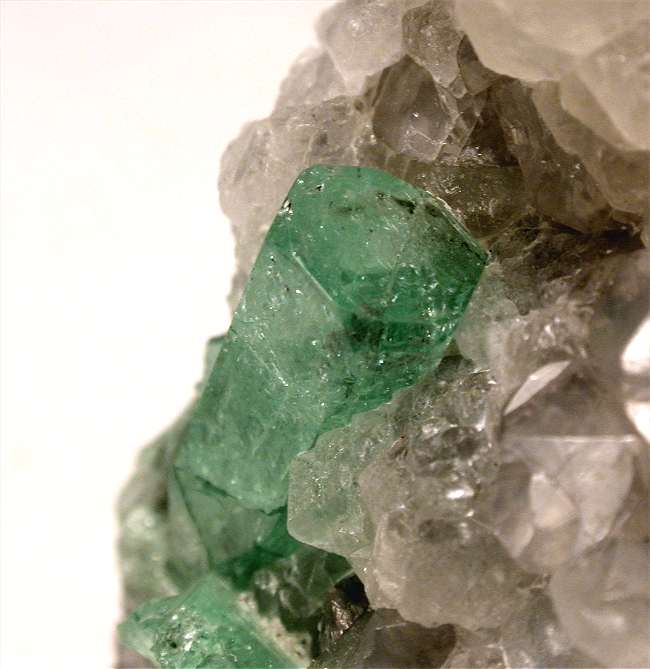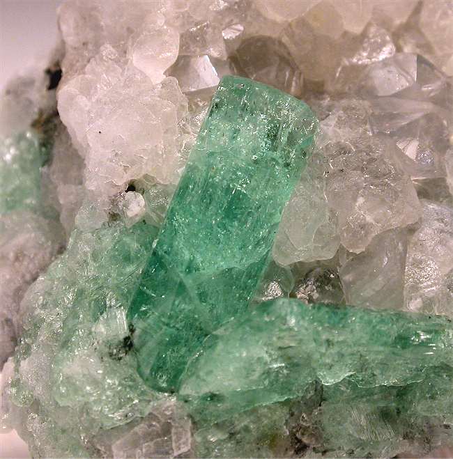 Muzo, Colombia - A super esthetic specimen hosting a perfectly terminated emerald crystal of 1.9 cm in size ! The color is bright green. The crystal has no damage and sits on quartz crystals. Other partial emeralds all around. Overall size is 5x3.5x3 cm