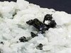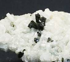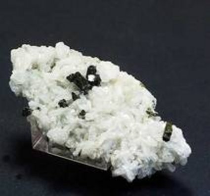 Varaita Valley, Cuneo Province, Piedmont, Italy - Very fine epidote crystals up to 1.5 cm. on a white base of albite crystals. The green of the epidotes are a showy view on the white albite coating of crystals ! the albites are up to 0.5-0.8 cm. An excellent example of alpine epidote association. Overall size is 9 × 4 × 2.55 cm