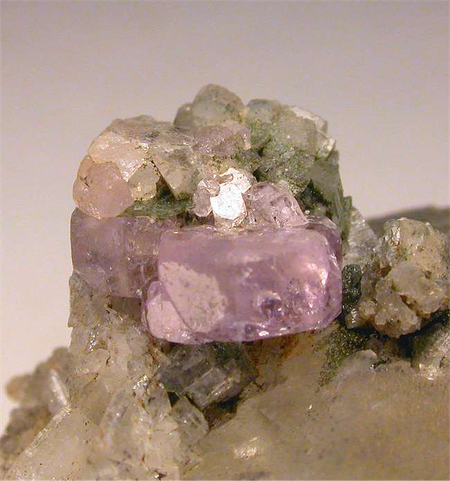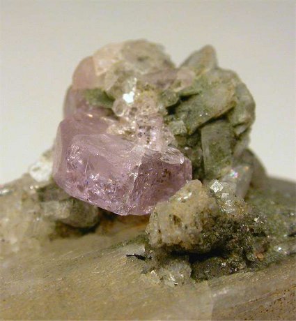 Niaslo, Basha Valley, Skardu Distr., Northern Areas, Pakistan - A nice light violet fluorapatite crystals sits on the top of a terminated well defined adularia crystal. The apatite is 0.7 cm wide and the adularia is 2.3x2 cm. Overall size is 2.5x2.4x2.2 cm