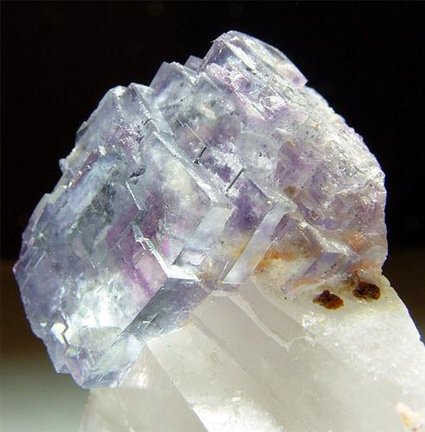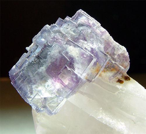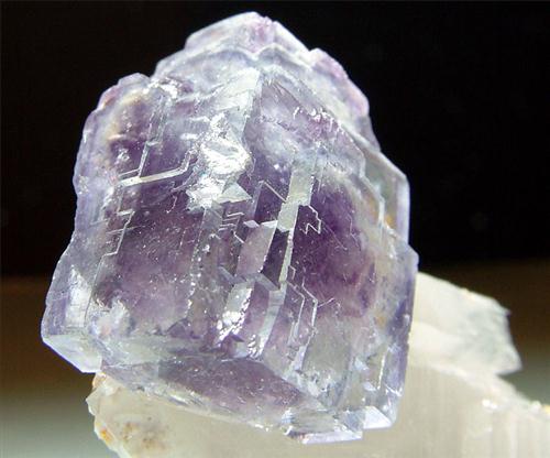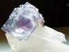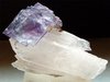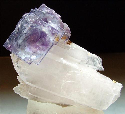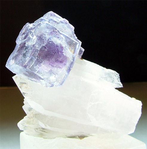 Yaogangxian Mine, Hunan, China - A fragment of terminated white quartz makes a base for a single zoned and phantom included complex stepped blue fluorite crystal. The fluorites are 1.5 cm on the edge. Some minor contacts, overall an aesthetic display. Overall size is 4.7x3.7x1.4 cm