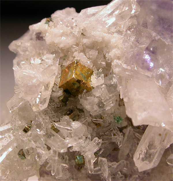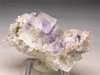 Shanghbao mine, Hunan Prov., China - A very nice fluorite specimen from thi famous locality. There are various fluorite crystals showing a nice waterclear aspect. The largest fluorite is 1 cm on the edge and shows a beautiful cuboctahedral violet phantom inside ! such phantom can be seen also in other crystals of this rock. Lot of colorless quartz are the crystalline matrix on which the fluoritea are nested. Some pyrite cubes also present. Nice esthetic specimen of 5x3x2.5 cm