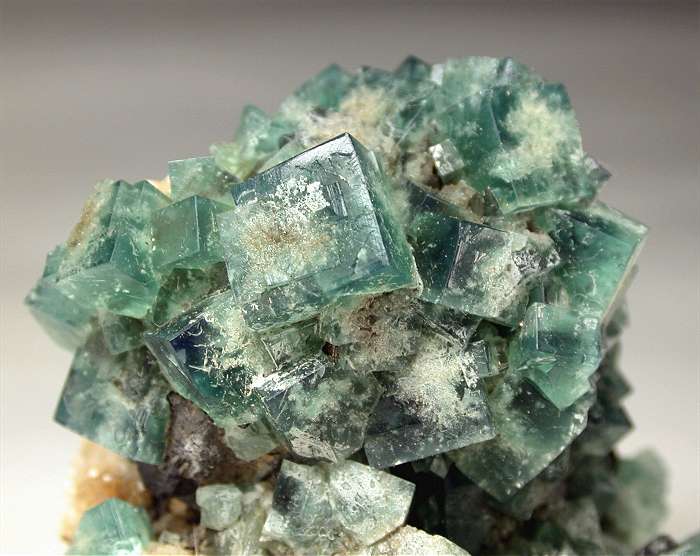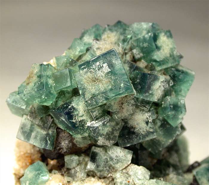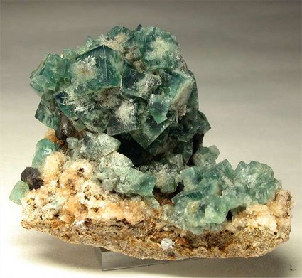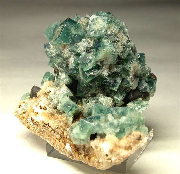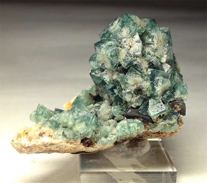 Rogerley mine, Frosterley, Durham Co., England - Very nice and esthetic fluorite specimen ! The rock hosts a number of cubic fluorites showing the classic green color under artificial light that becomes blue under the sunlight ! An old timer since this specimen has been aquired in the 2000 ! most of the crystals are 0.8-1 cm on the edge and form a nice cluster that dominates the whole specimen. There are at least more than 3 dozens crystals here ! Among the fluorites athere are also some galena crystals of 1 cm on the edge, black in color. Very nice specimen ! it comes with the orihinal label from the mine. Overall size is 7x5.5x5 cm