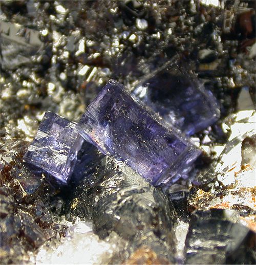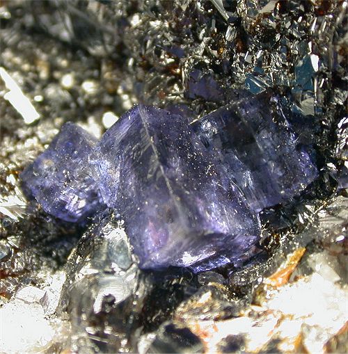 ELMWOOD MINE, CARTHAGE, TENNESSEE - This specimen consists in a crystalline sphalerite, bright red and well shaped with some violet fluorite cubes up to 0.7 cm on the edge. Nice rock of 5.5x5.5x3 cm in size