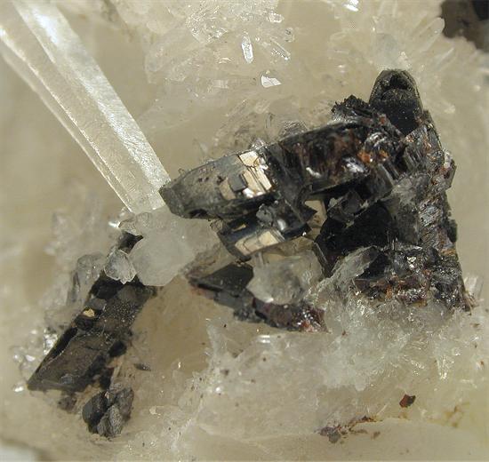 Mundo Nuevo, Pasto Bueno District, Pallasca Prov., Ancash Depart., Peru - Nice cluster of terminated quartz crystals up to the size of 5 cm ! There are various hubnerite crystals 0f 0.3-0.5 cm located at the base of the quartzes. Very nice specimen of 5x2.2x2 cm in size. Ex G. Tribbey Collection
