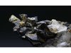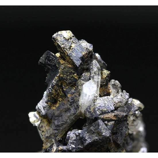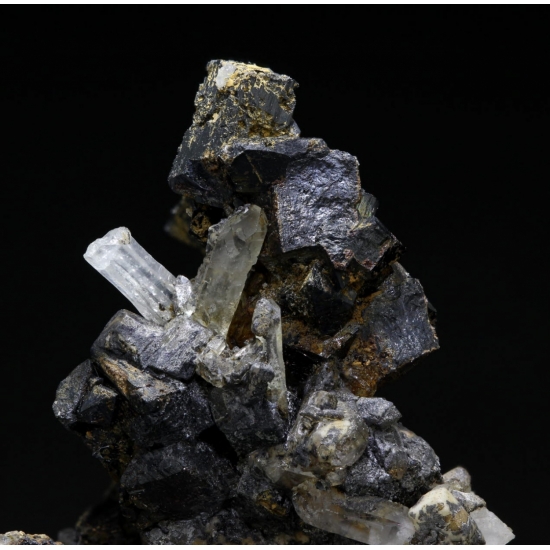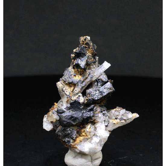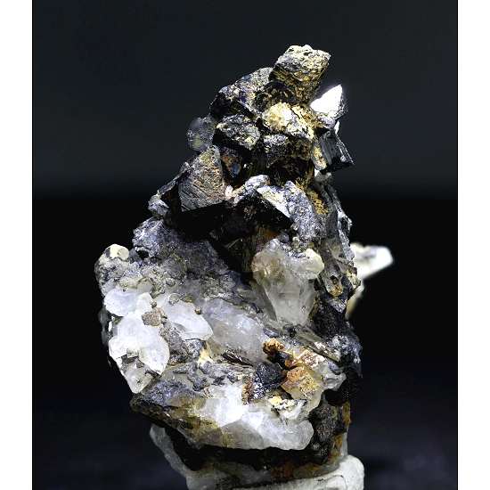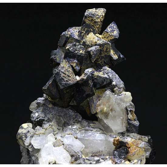 Campiglia Marittima, Livorno Province, Tuscany, Italy - Small black terminations of stand around a small amount of quartz matrix with a few isolated crystals of quartz. The quartz crystals are unfortunately broken for the most part with a few nicks to the ilvaite but plenty of very good crystals on display. The ilvaites are 0.5 cm in size. Overall size is 3.4 × 2.7 × 1.9 cm