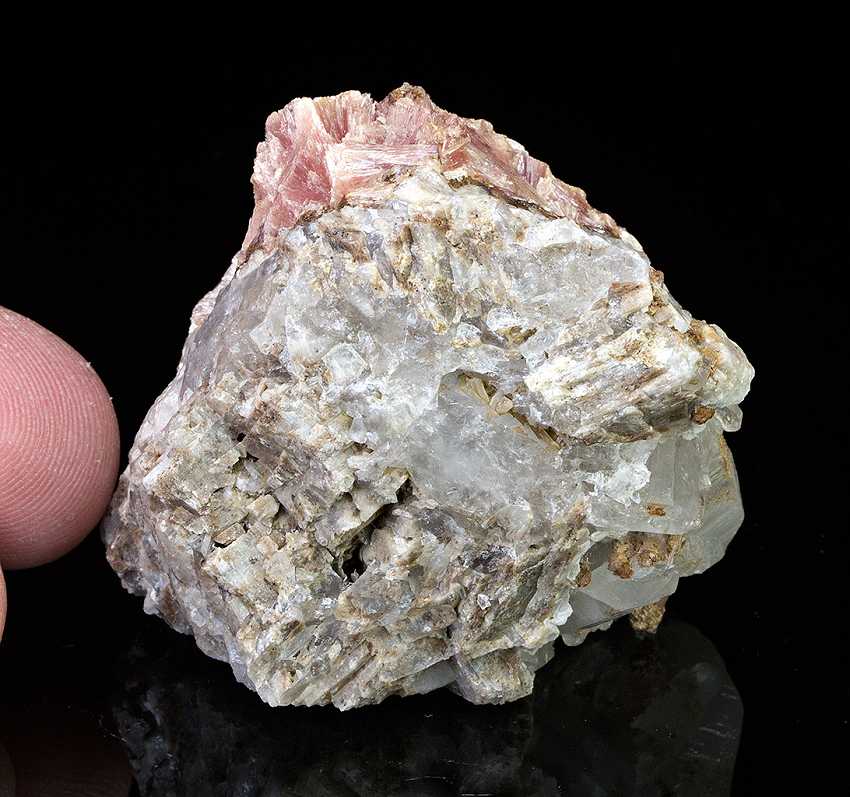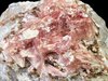 Fengjiashan Mine, Daye Co., Hubei Province, China - Attractive pink crystallized in a site covering an area approximately 3.0 x 3.0 cm in size nice on the front side of a 5.0 x 5.0 x 4.0 cm crystallized calcite matrix. In good condition as seen with minimal micro-chipping, this is richly crystallized for the species. Brown micro hubeite present as well. Sits beautifully by itself for display, this upon a sawn base. Overall size is 5.0 x 5.0 x 4.0 cm. Weight is 88 gr