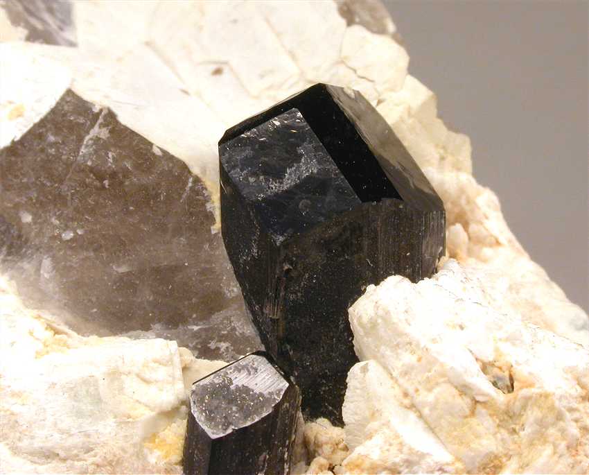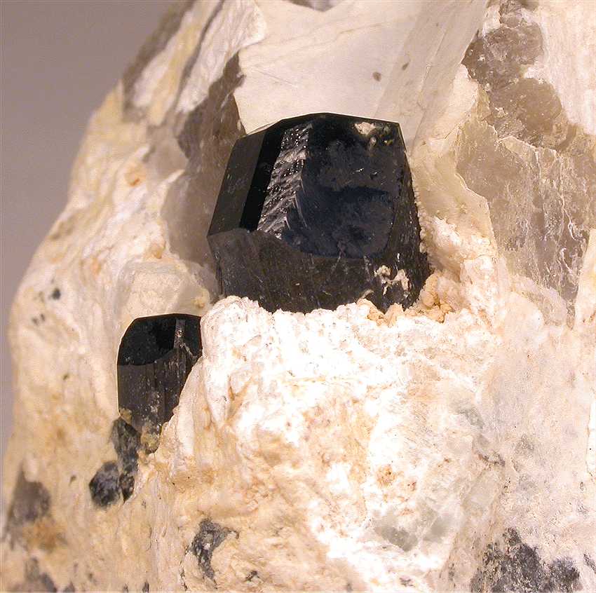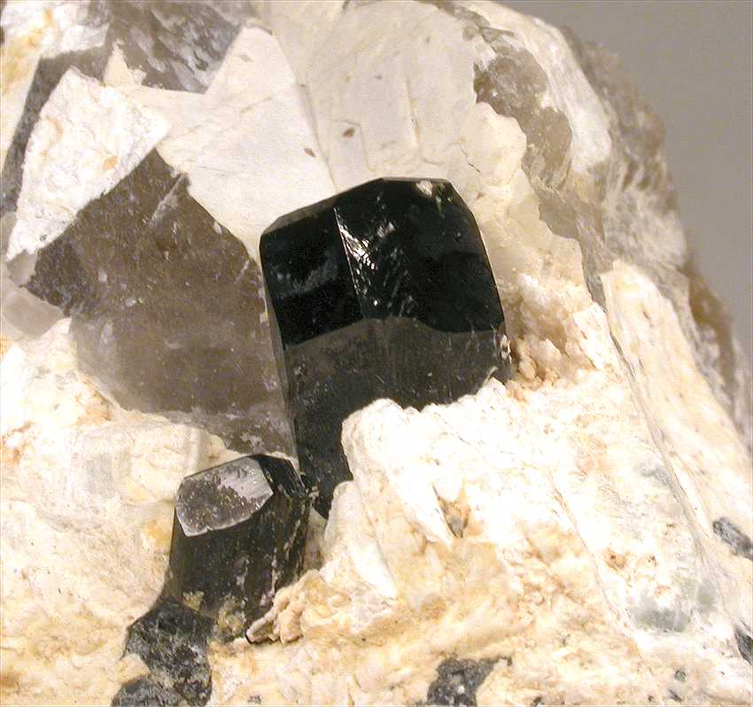 Manapa, Madagascar - A couple of perfectly terminated liddicoatites show up on this specimen ! Both crystals show greatly ! Their sizes are 1.5 and 0.8 cm in size. Both are perfectly terminated ! Nice rock of 6.5x5x4 cm.