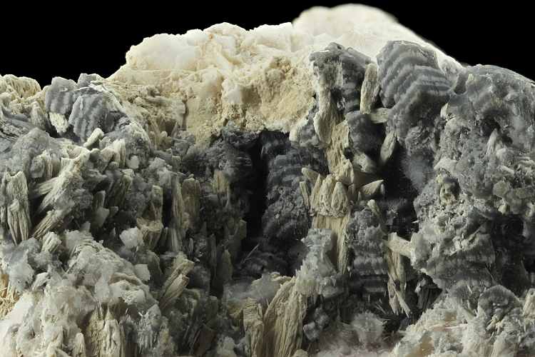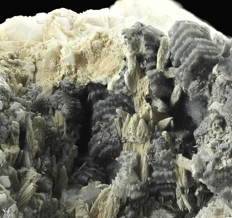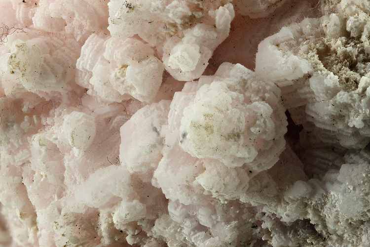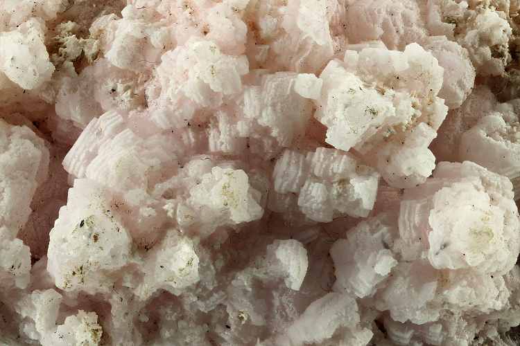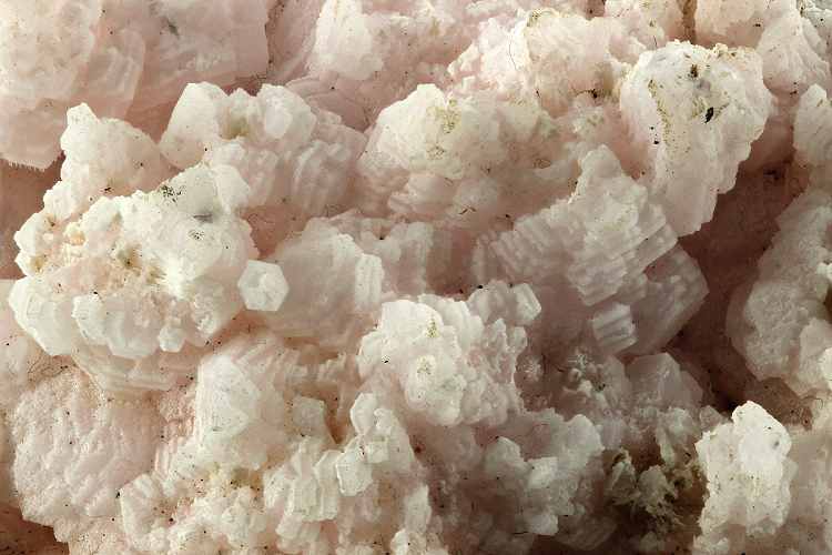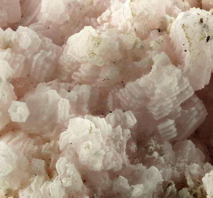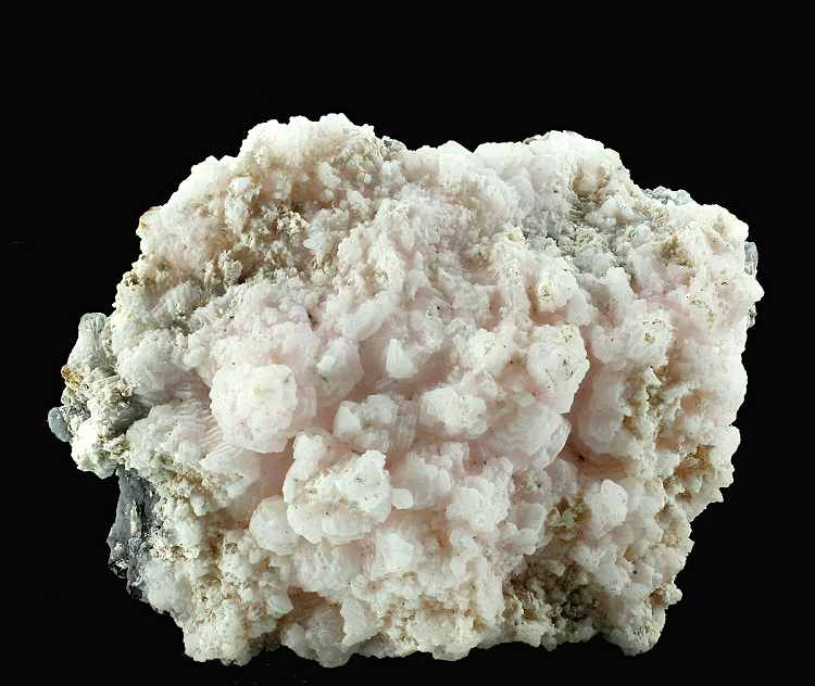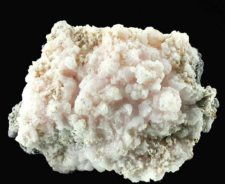 Cavnic Mine, Maramures County, Romania - A pinkish mass of interlocking pale pink flat manganoan calcite crystals partly coated with aggregates of tiny white calcite. The net effect is a mass of striped crystals. On the reverse shows the calcite being included to give a black and white effect. Really interesting piece. An example of one of the Romanian classics and not often seen. Overall size is 8.6 × 5.9 × 5.2 cm.