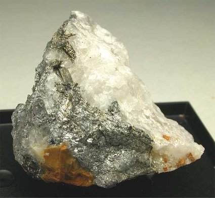 BOTTINO MINE, SERAVEZZA, CARRARA, ITALY - Nice bright metallic crystal of the rare meneghinite ! The crystal is 0.5 cm in size and is located in an open cavity of the qurtzite matrix. Overall size is 4x4x2.5 cm