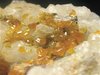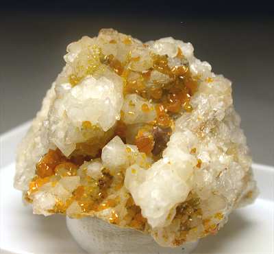 DRY GILL MINE, CALDBECK FELLS, CUMBRIA, UK - Bright yellow mimetite crystals are dispersed on the matrix and on white quartz crystals. The mimetites are up to 1-2 mm. Overall size is 3x3x2 cm.