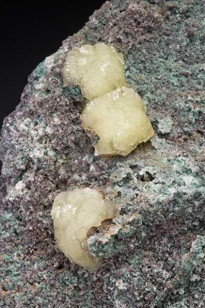 Tsumeb Mine, Tsumeb, Otjikoto Region, Namibia - Peculiar mimetite formations are on this rock ! Yellowish crystal groupings of mimetite to 0.5 cm in size scattered over a 4.0 x 3.0 x 1.0 cm matrix. Ex Hans Luthi collection.