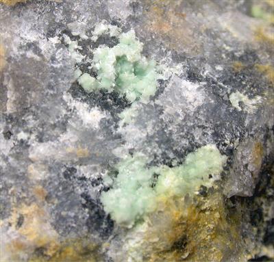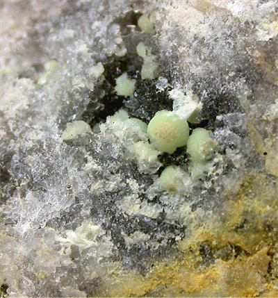 PERETA MINE, GROSSETO, ITALY - On the silicized limestone of this rock there are several 1 mm minyulite greenish spheroids.Minyulite is an uncommon mineral, almost rare now that Pereta mine is no more accessible. Overall size is 5x5x3 cm