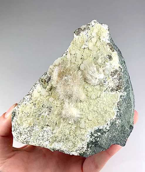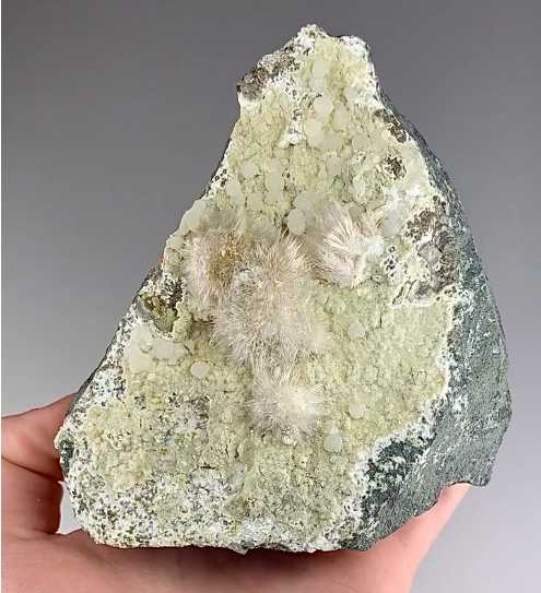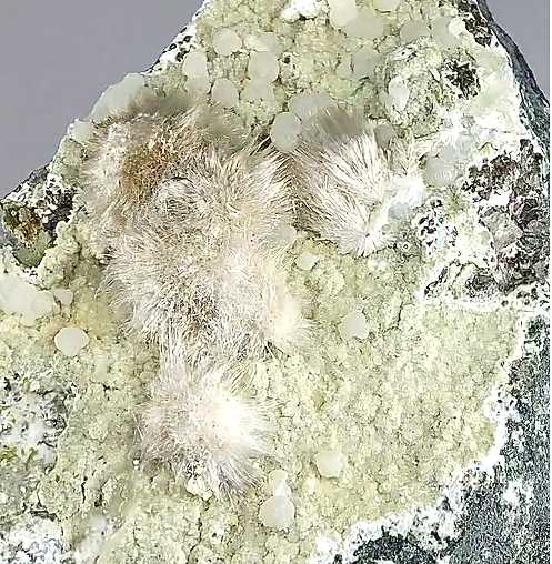 Kandivali Quarry, Mumbai, Maharashtra, India - Silky acicular crystallized okenite forming flat sprays of crystals and groupings to 3.0 cm across with spherical shaped crystals of gyrolite. A classic from the indian basaltic quarries. Overall size is 12.0 x 10.0 x 5.0 cm