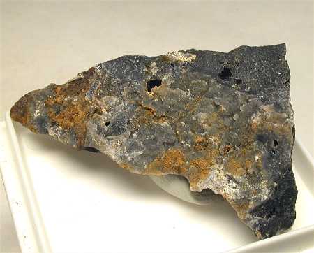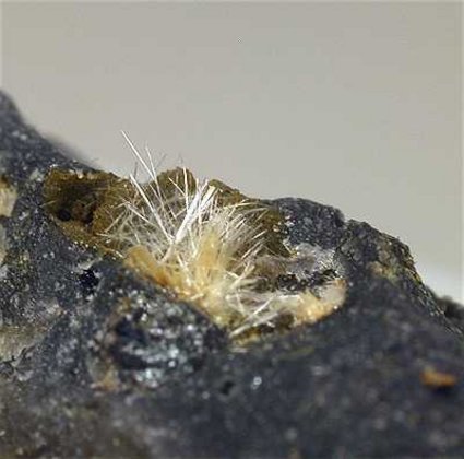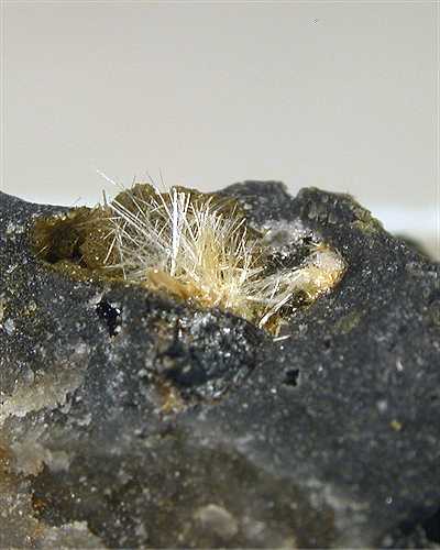 Le Cetine mine, Siena, Italy - A rare mineral from the type locality. Onoratoite derves from stibnite oxidation and shows as groups of white acicular crystals. This rock has a great cluster of millimetric crystals well visible on the edge of an open cavity. Overall size is 4x2.5x1.5 cm