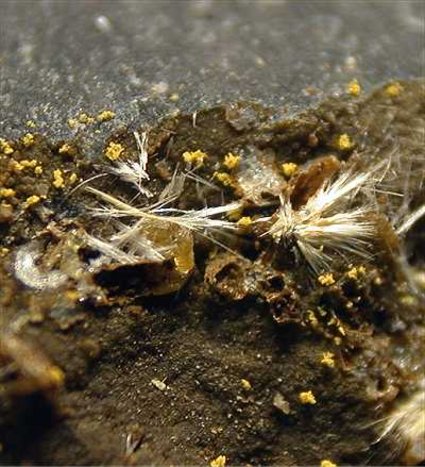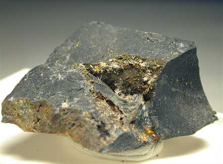 Le Cetine mine, Siena, Italy - A rare mineral from the type locality. Onoratoite derves from stibnite oxidation and shows as groups of white acicular crystals. This rock has several clusters of millimetric crystals nicely dispersed on an open cavity. Overall size is 3x3x2.2 cm