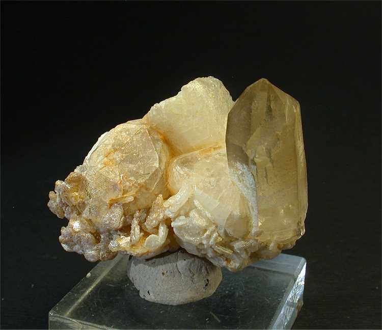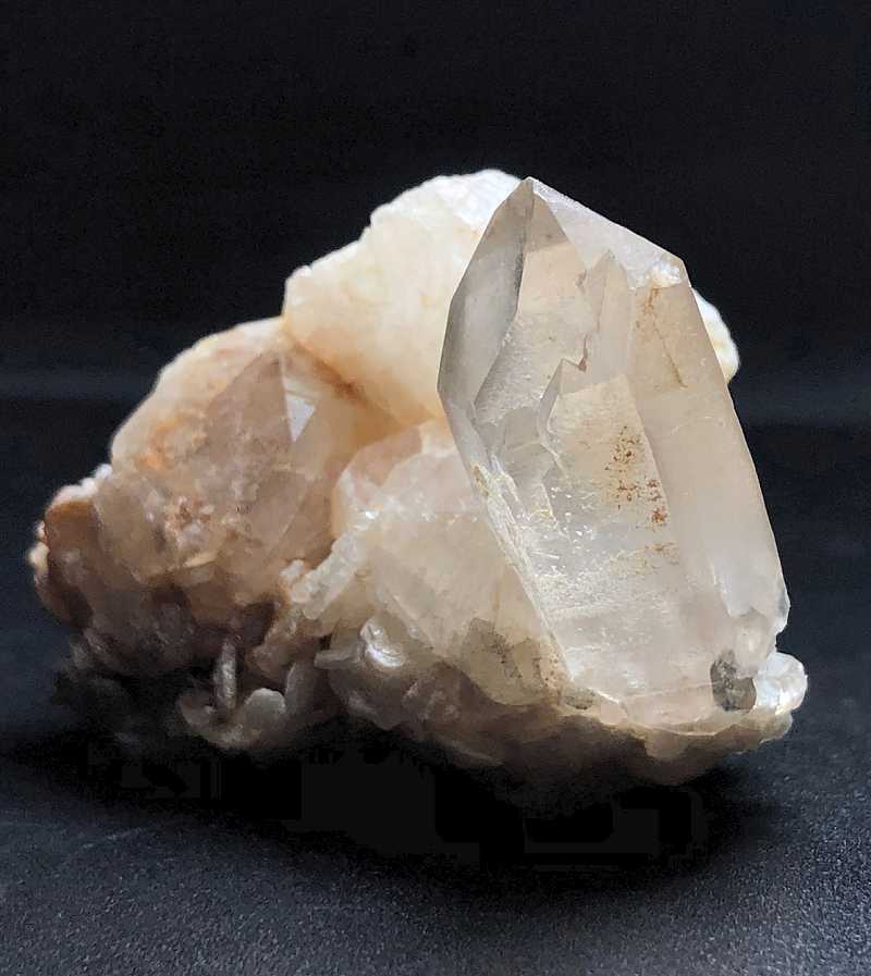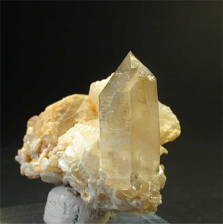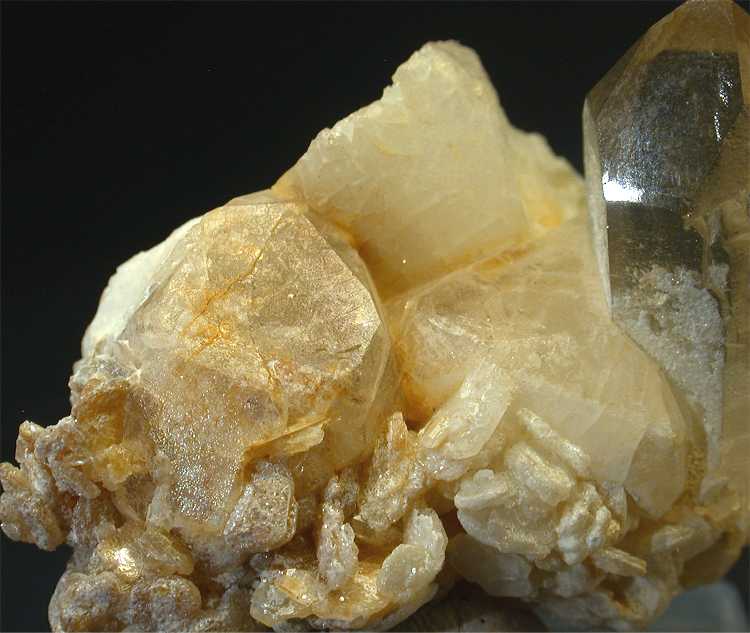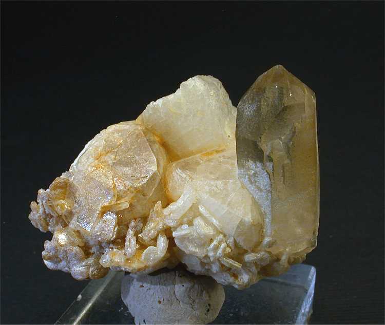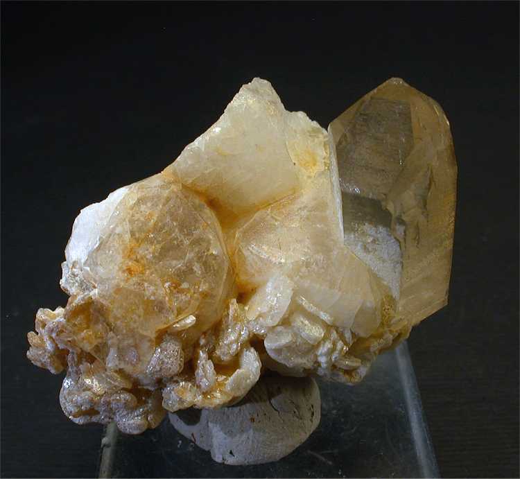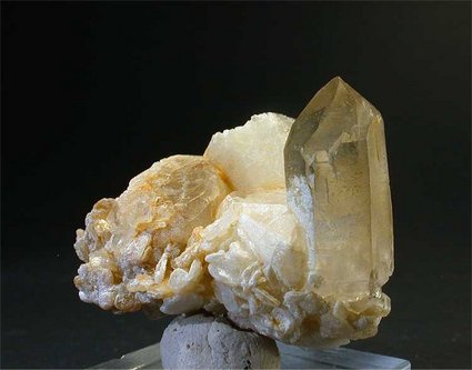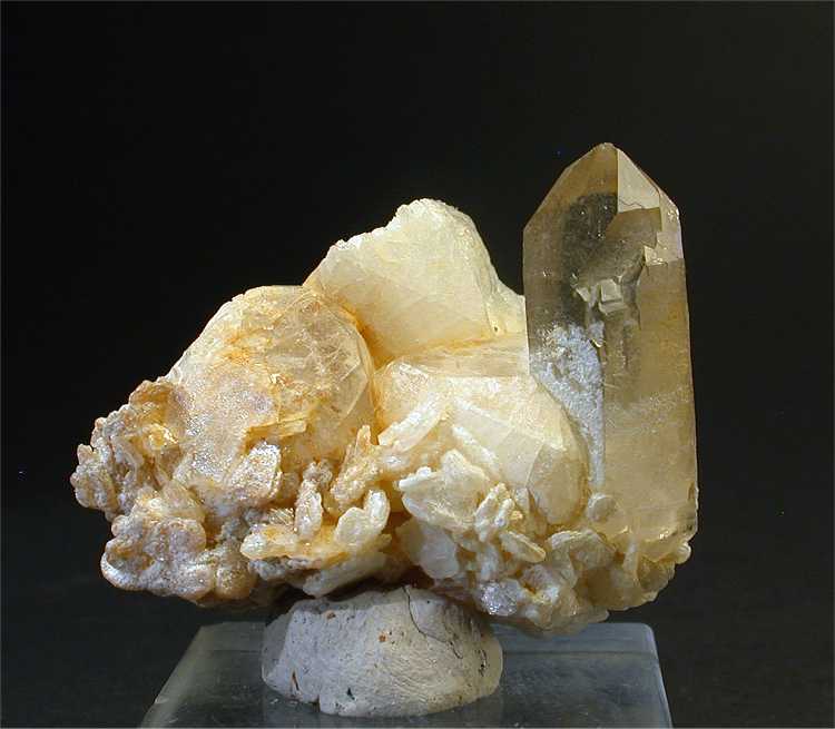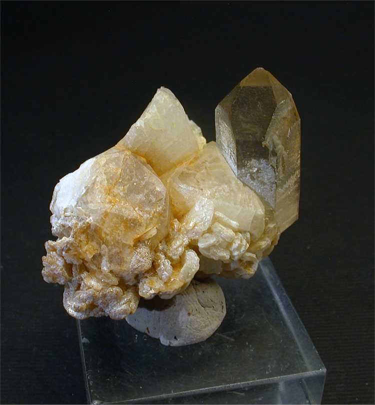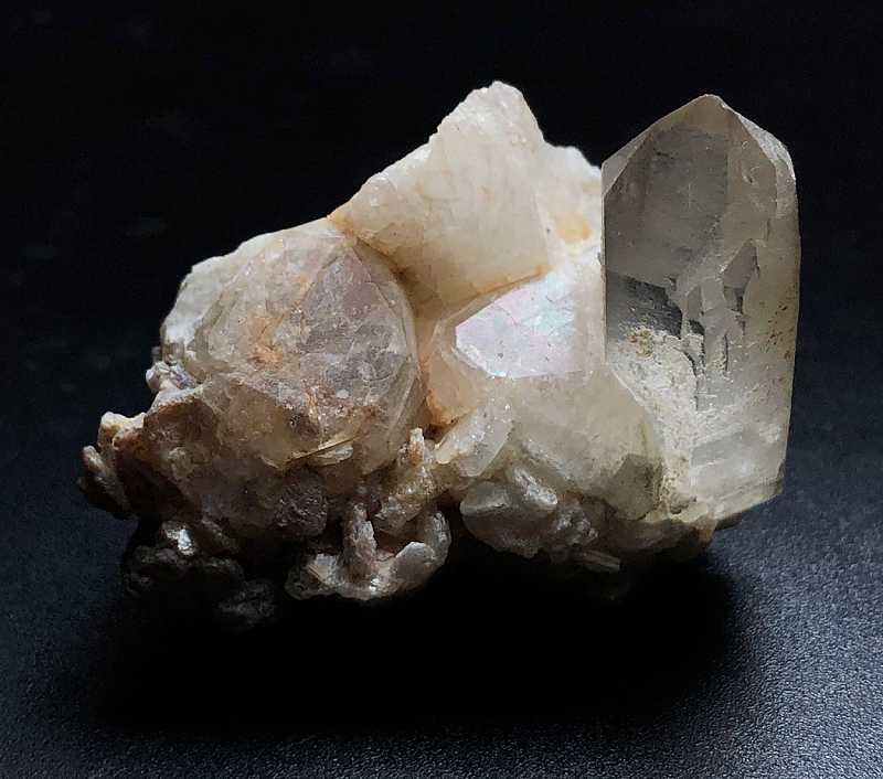 Mawi, Nuristan Province, Afghanistan - This specimen hosts a couple of well shape terminated pollucite crystals 1.5-1.6 cm wide ! Great crystals ! There is also a biterminated quartz crystal 2.8 cm in size. Great specimen. Overall size is 3.9 × 3.4 × 1.8 cm.