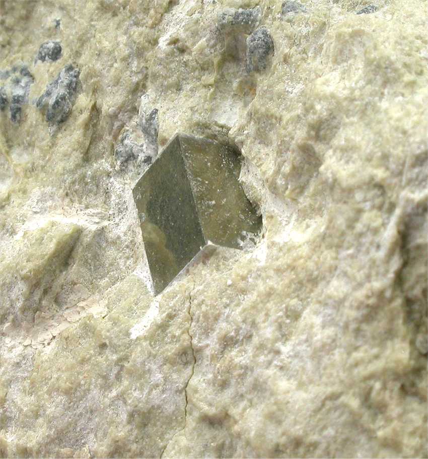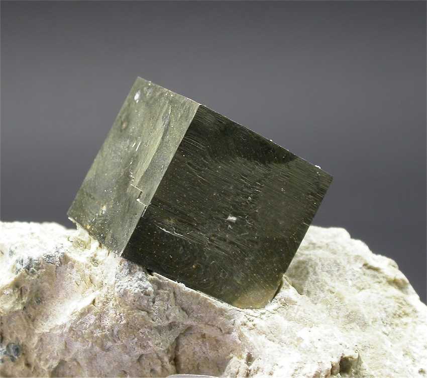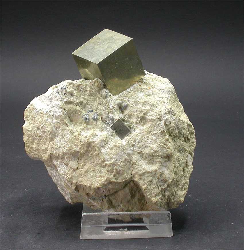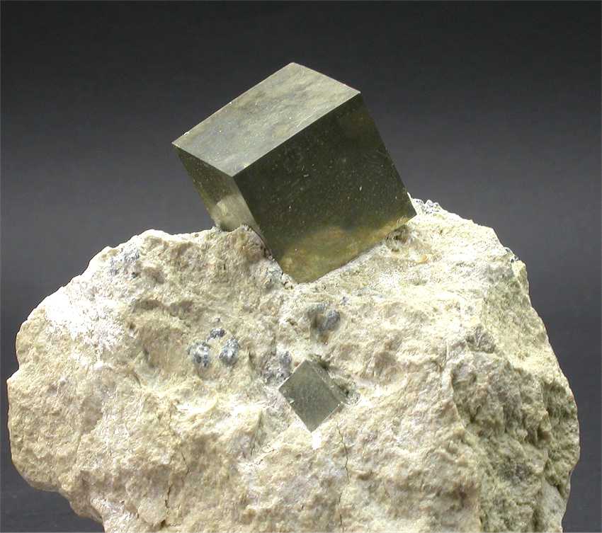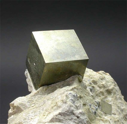 Navajun, Spain - Brigth golden pyrite cube 2 cm on the edge shows nicely on matrix ! A classic from Spain. There is a smaller cube, close to 1 cm on the edge still partly included in the matrix. Nice specimen ! This is a well known locality the produces quite perfect pyrite cubes. Overall size is 8x7x4 cm . Weight is 343 gr