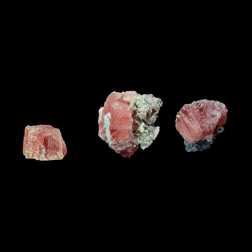 Sweet Home mine, near Alma, Park County, Colorado - For those who don't know, Richard Kosnar mined the Sweet Home for a few years during the late 1970's and managed to collect some excellent Rhodo specimens. This piece is from one of the last pockets that Rich and his mine foreman Dave Bergman (Brian Kosnar's maternal grandfather) opened before they were done at the mine. These three specimens feature a lovely pink-red color rhombohedra of Rhodochrosite; two of which have a bit of attached matrix. The crystals are sharp and well-formed with great color and translucency for the size I don't have to tell you that these pieces are selling for top dollar across the board. A worthwhile set of specimens of Rhodochrosite from this most classic of localities. Overall sizes 1.5 x 1.4 x 1.3 cm to 0.9 x 0.7 x 0.3 cm