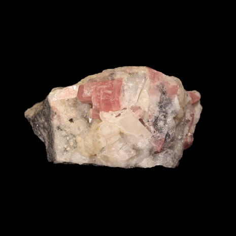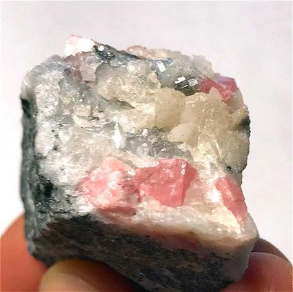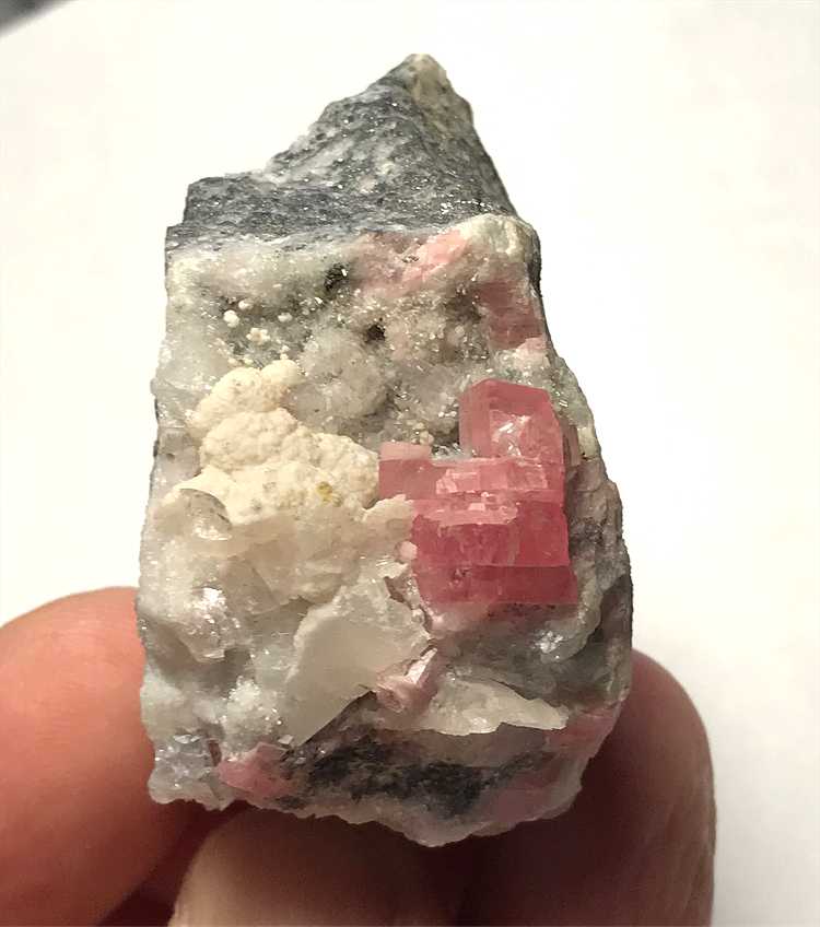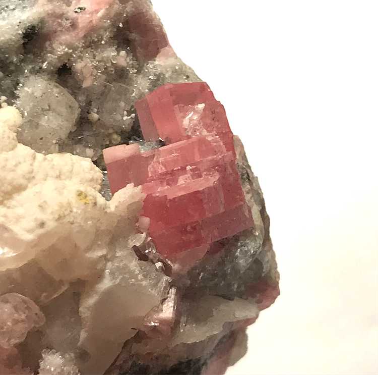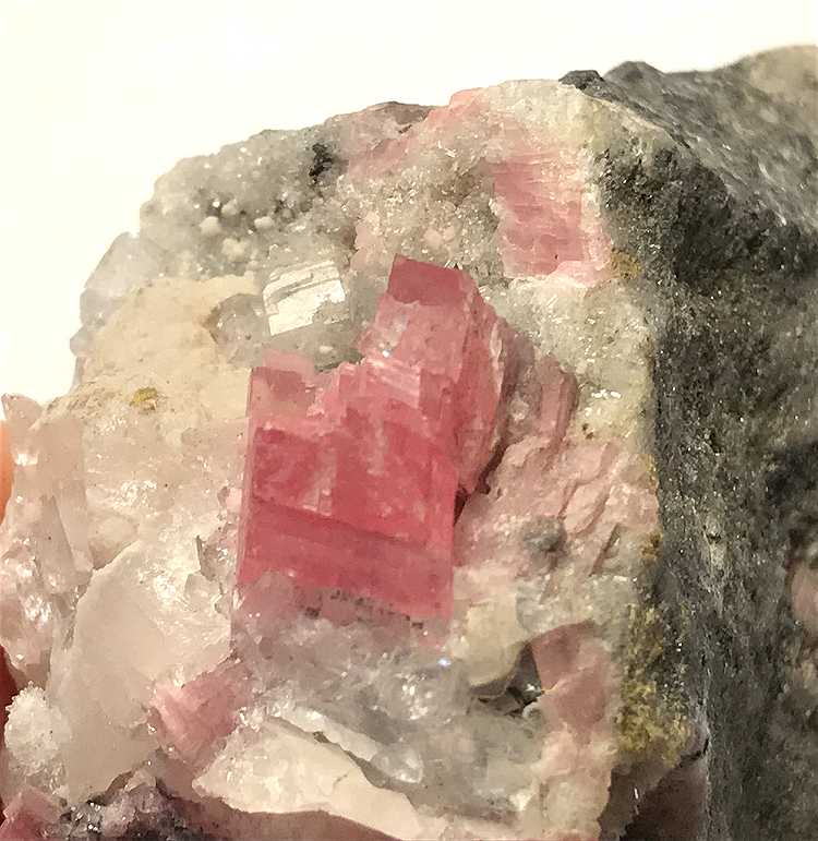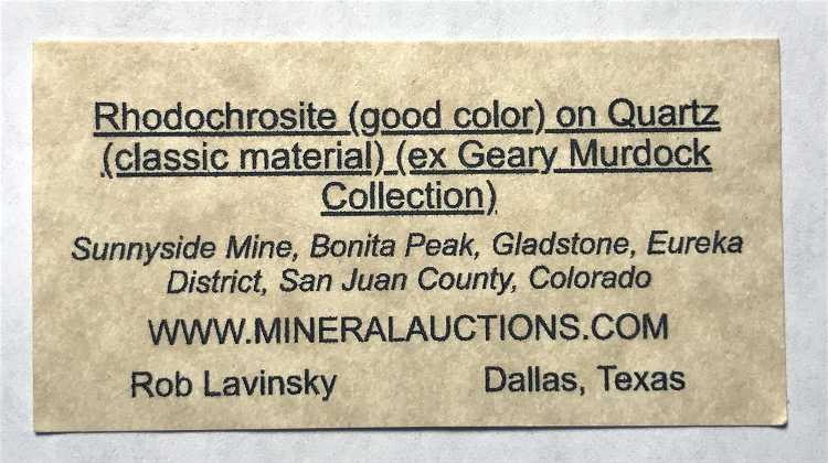 Sunnyside Mine, Bonita Peak, Gladstone, Eureka District, San Juan County, Colorado - The Sunnyside Mine produced some very well known Rhodochrosite specimens in its history, along with some attractive association pieces. This specimen features sharp, well-formed, attractive rhombohedra of notably RED colored Rhodochrosite which are associated with Quartz on matrix. The largest Rhodo crystal measures 7 mm, but the most imporant aspect is the RED color of the rhombs, as the vast majority of Sunnyside Rhodos are a shade of pink, and red crystals are very hard to find. Beautiful, classic material and is a true staple of any good Colorado collection. From the worldwide collection of noted Idaho collector Geary Murdock. Overall size is 5x3.5x3 cm
