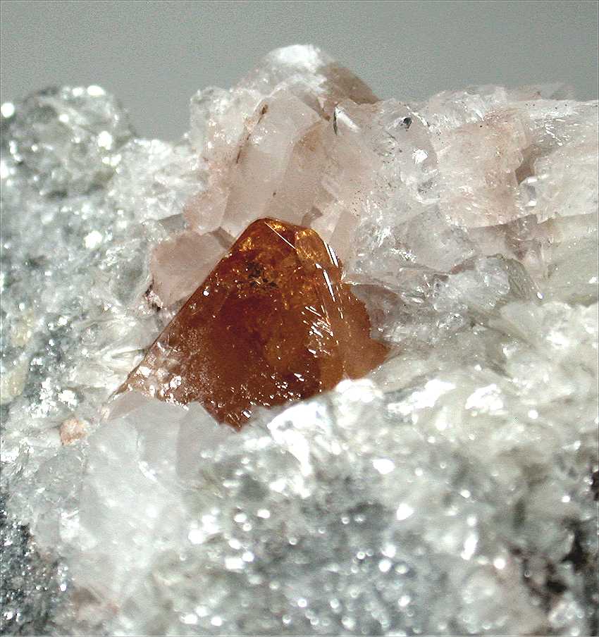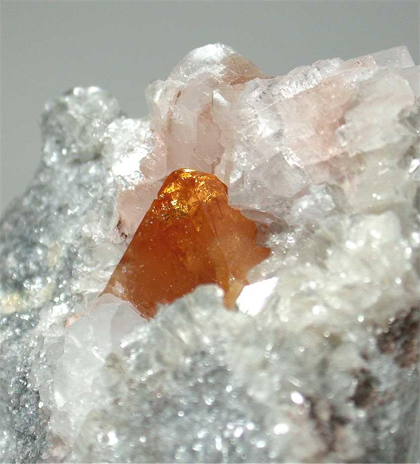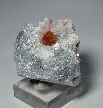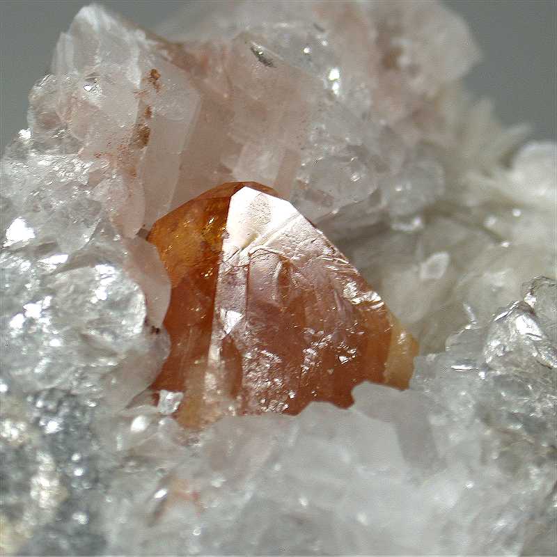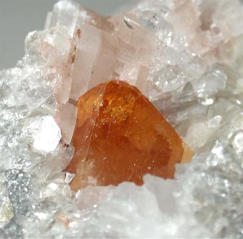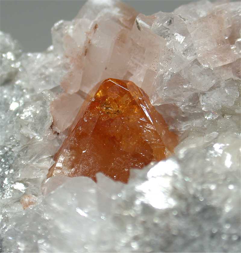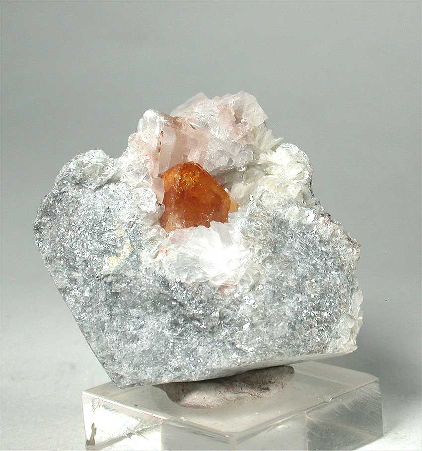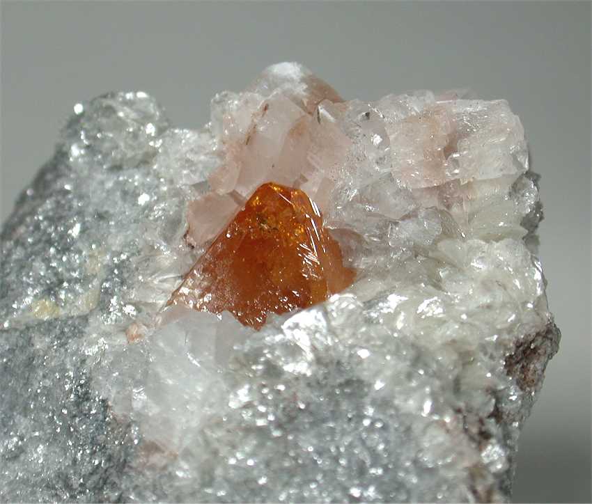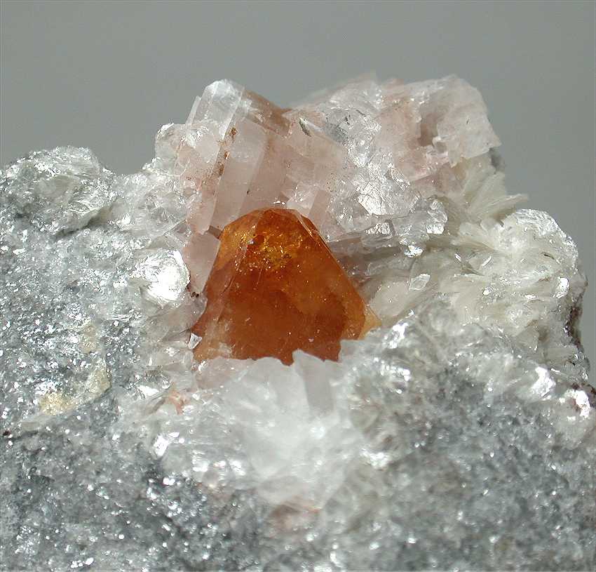 Hu Nan Province, China - Bright oragnge scheelite, undamged and gemmy, shows on this rock ! The scheelite is 1 cm on the edge and has an incredible oragnge color ! Very nice and showy specimen of 5x4.5x2 cm.